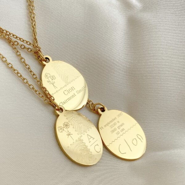 Wij graveren de vingerafdruk in het sieraad, waardoor deze voelbaar is en het sieraad extra bijzonder maakt. De bedels zijn hooggepolijst, waardoor de gravure een mooie schittering heeft. Laat een vingerafdruk graveren op een ketting, armband, oorbellen of ring.