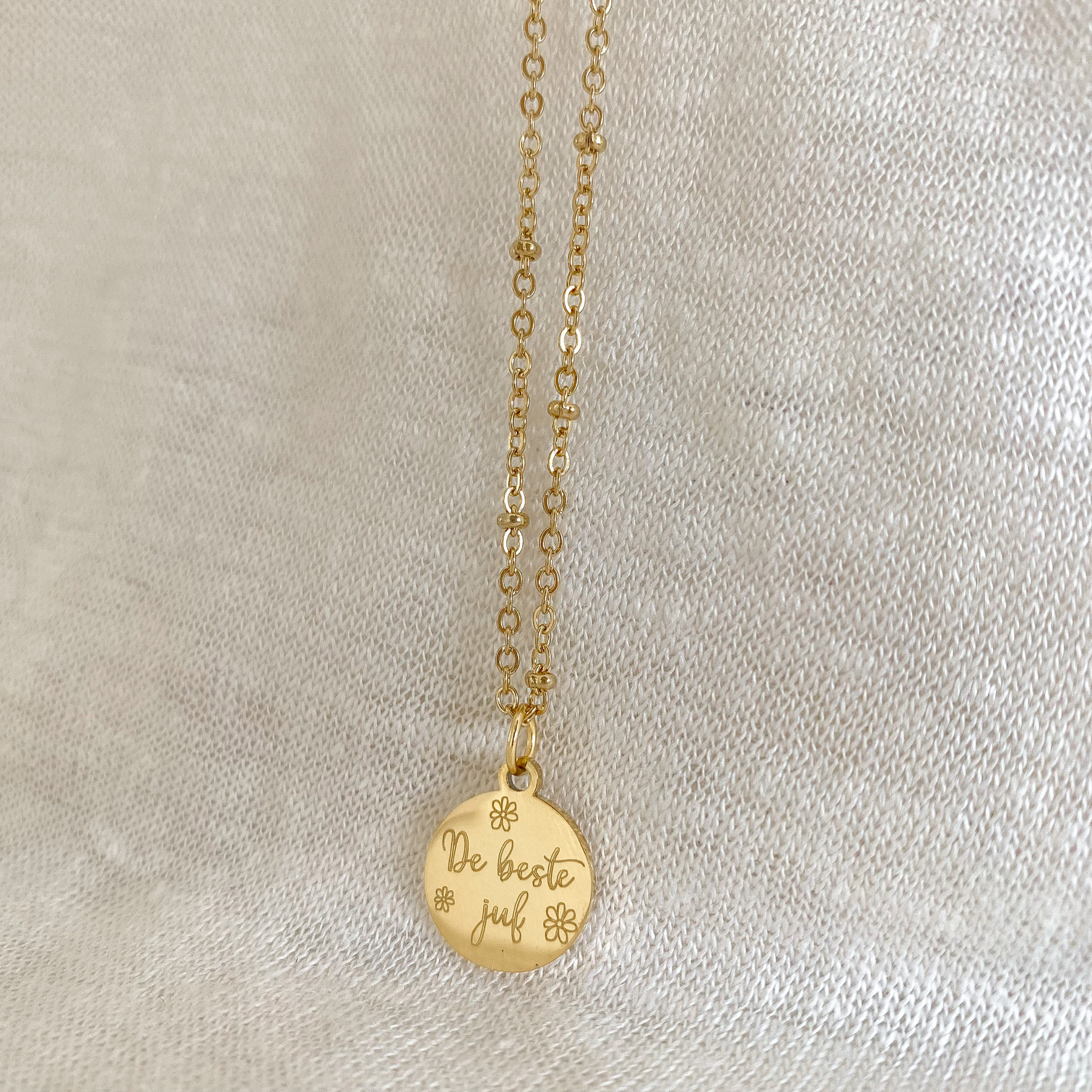 Afscheidscadeau De Beste Juf ketting, gemaakt van stainless steel. Geef de lieve juffrouw van jouw kindje een eindejaarscadeau die ze nooit meer zal vergeten. De ketting is duurzaam, kleurvast, hypoallergeen, sterk en betaalbaar. Personaliseer de achterkant met een leuke tekst en jouw kindje heeft het meest originele cadeautje van de hele klas! De juffrouw kan met trots jaren lang De Beste Juf ketting dragen.