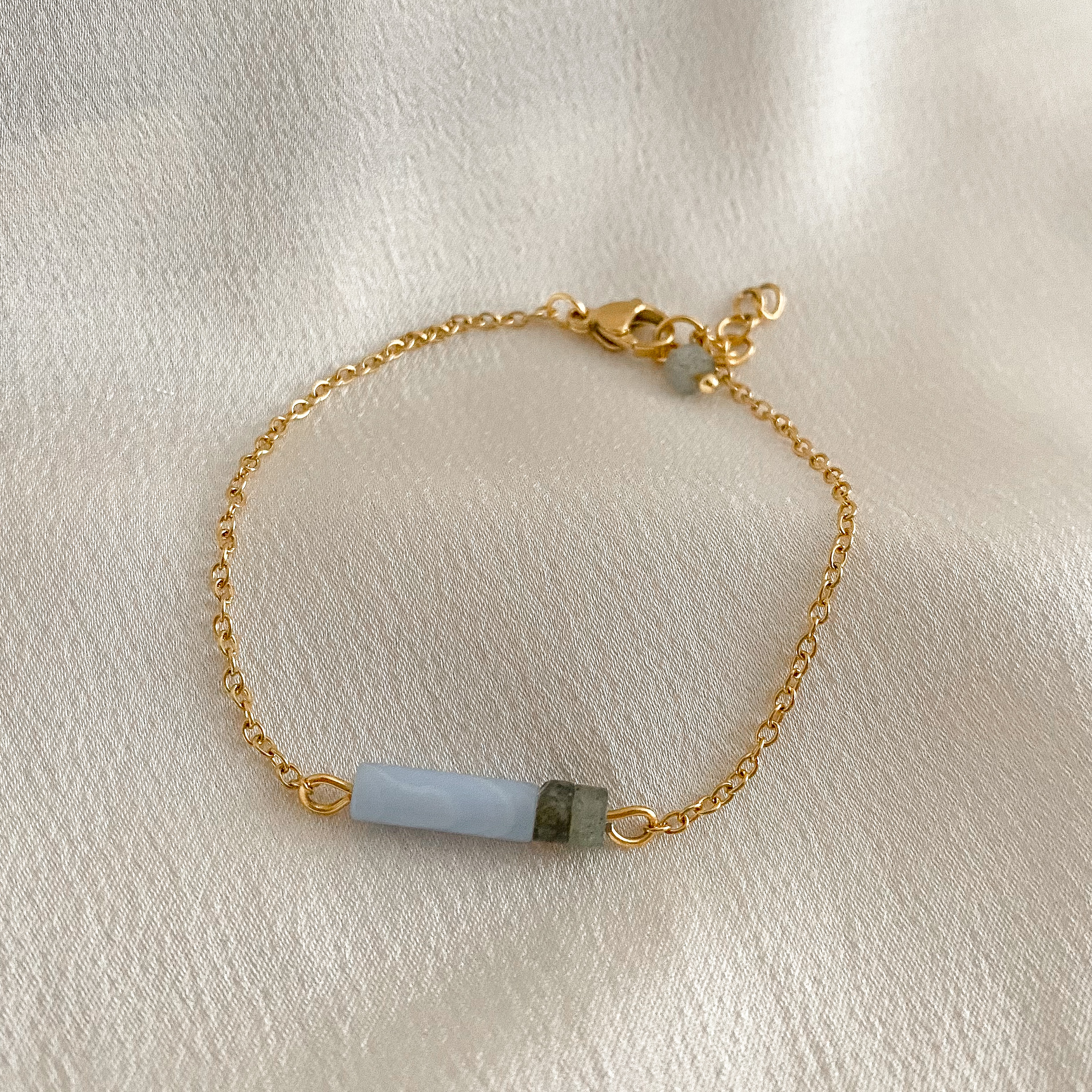 Aquamarijn & Labradoriet armband, met een klein labradoriet hangertje bij het slotje. Het armbandje is gemaakt van stainless steel, net als alle andere sieraden in de collectie. Alle sieraden zijn sterk, duurzaam, hypoallergeen en kleurvast.