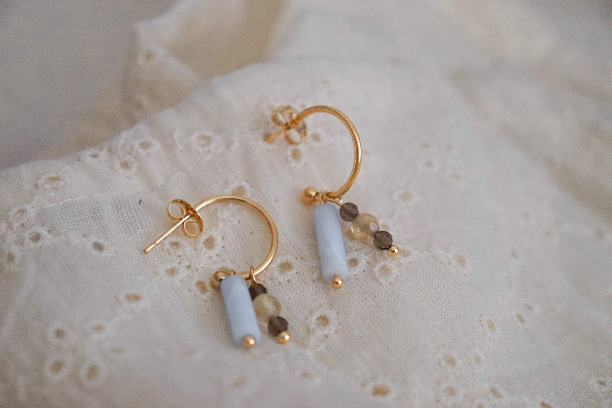 Aquamarijn, Rookkwarts & Citrien oorringen, gemaakt van stainless steel. De Citrien en Rookkwarts steentjes zijn facet geslepen en schitteren mooi.