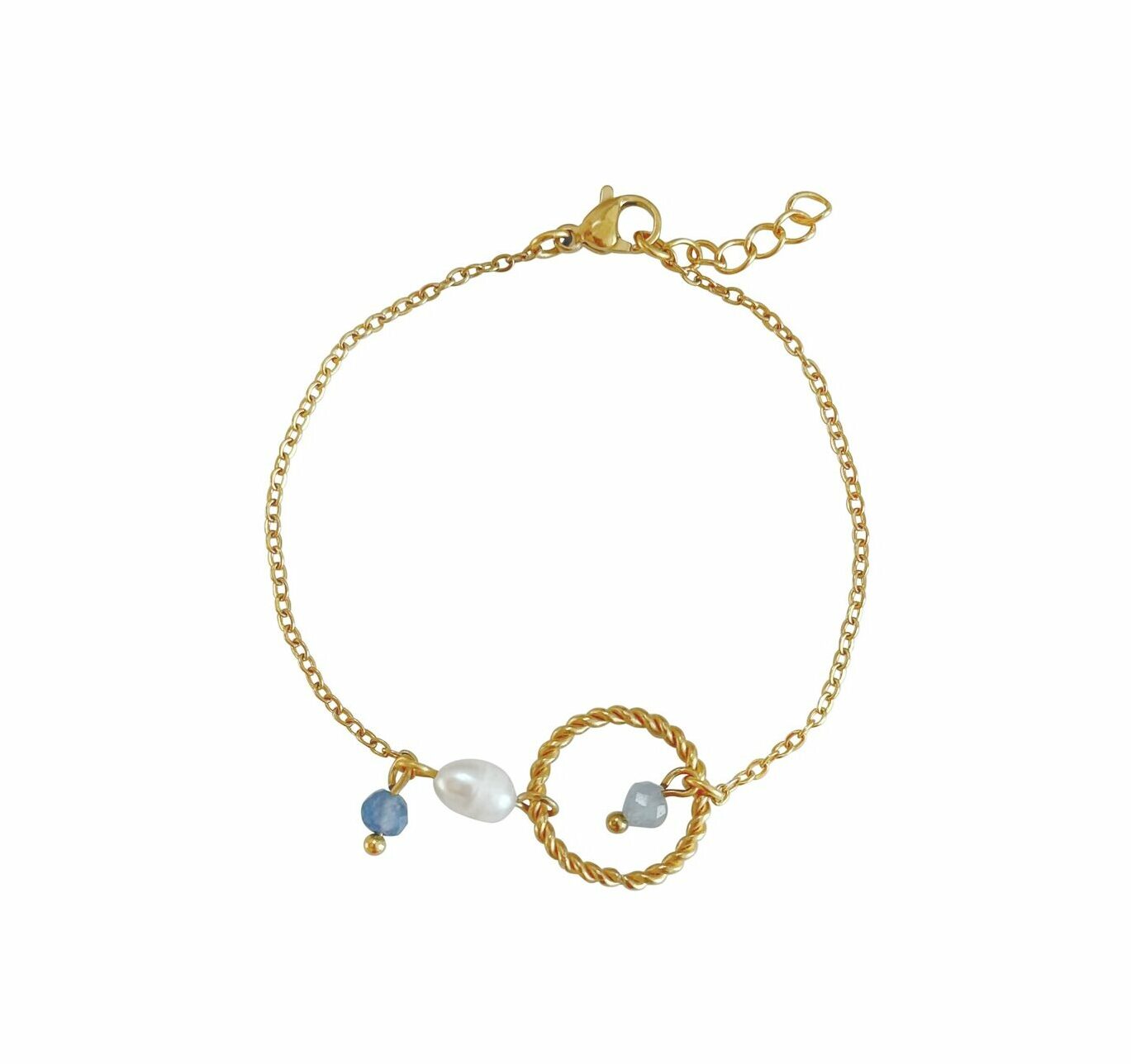 Aquamarijn, Saffier & Parel Armband, gemaakt van stainless steel. Het armbandje wordt gemaakt in ons eigen atelier en is duurzaam, sterk, hypoallergeen en kleurvast. De ring aan het armbandje heeft een mooi gedraaid effect. De edelsteentjes zijn facet geslepen en glinsteren mooi.