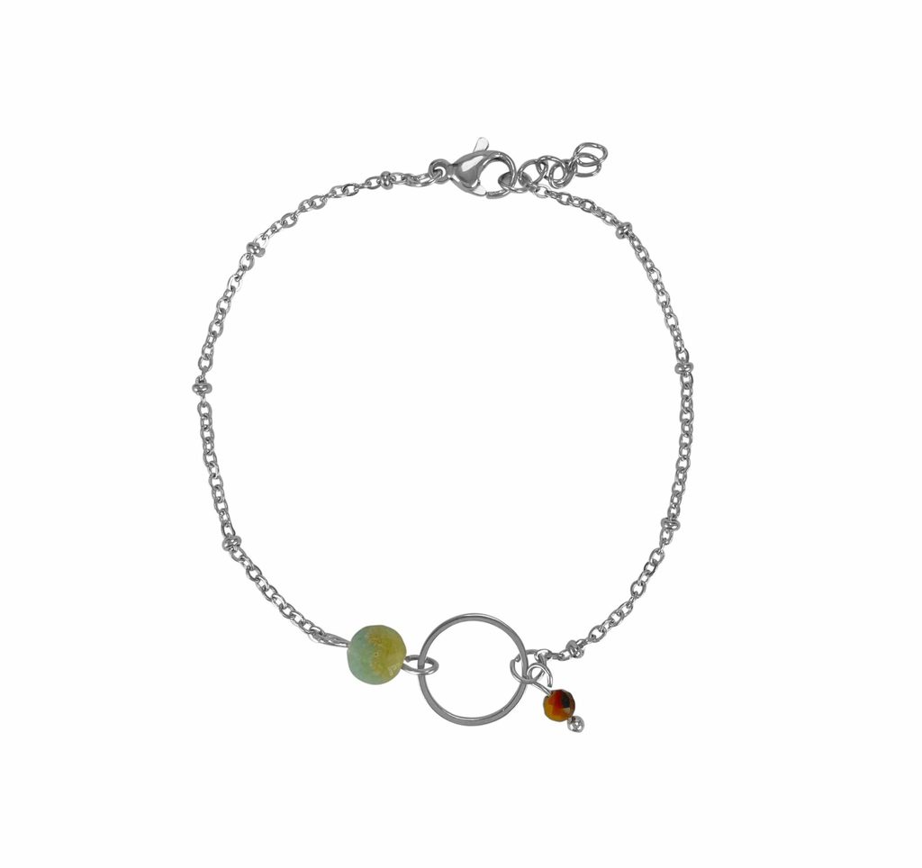 Armband Amazoniet & Tijgeroog Ring, gemaakt van Stainless Steel. Het Amazoniet en Tijgeroog steentje zijn facet geslepen en glinsteren vanuit elke hoek. De stainless steel ring is een extra leuk detail. Amazoniet varieert van helder fel blauw tot licht blauw, gecombineerd met warme natuurtinten. Elk steentje is anders en uniek.