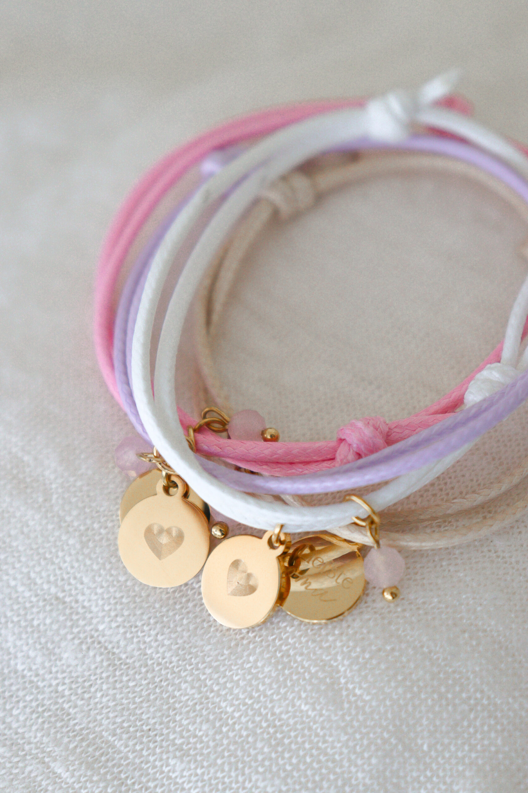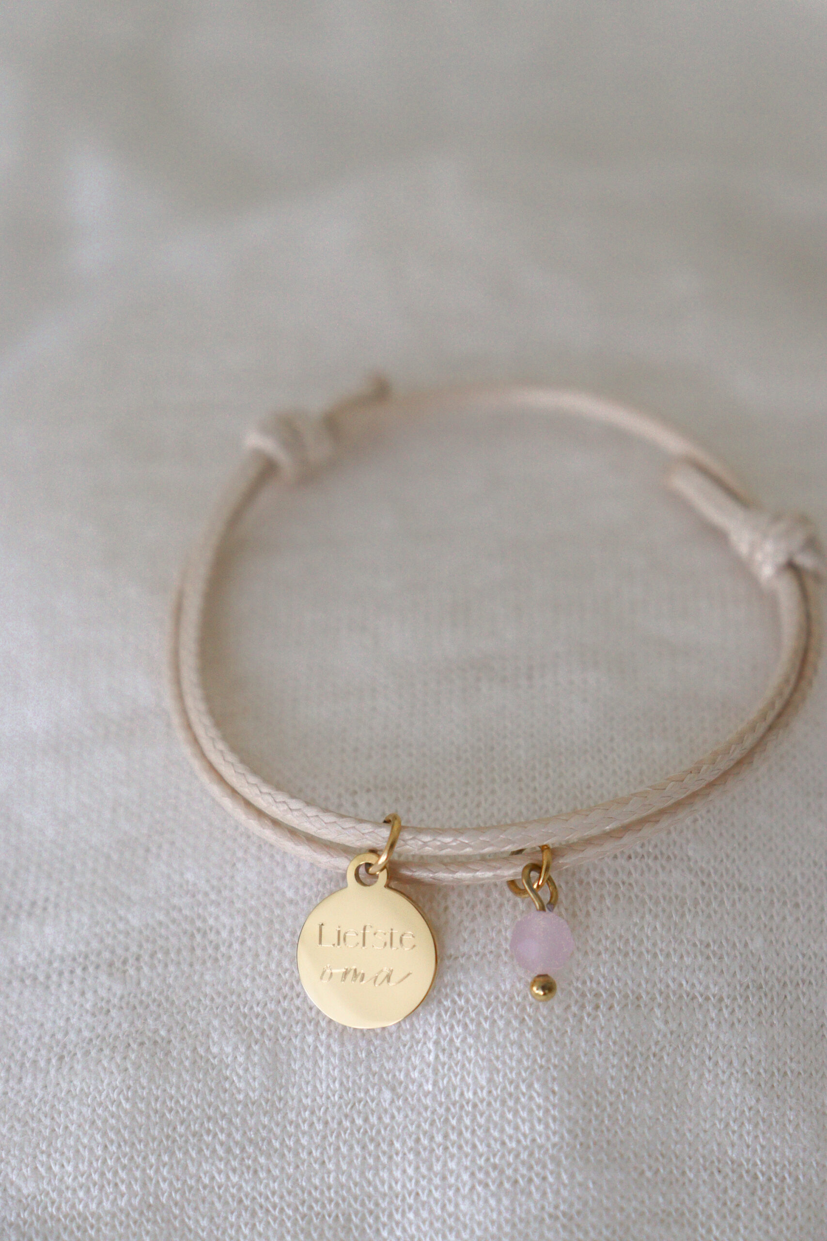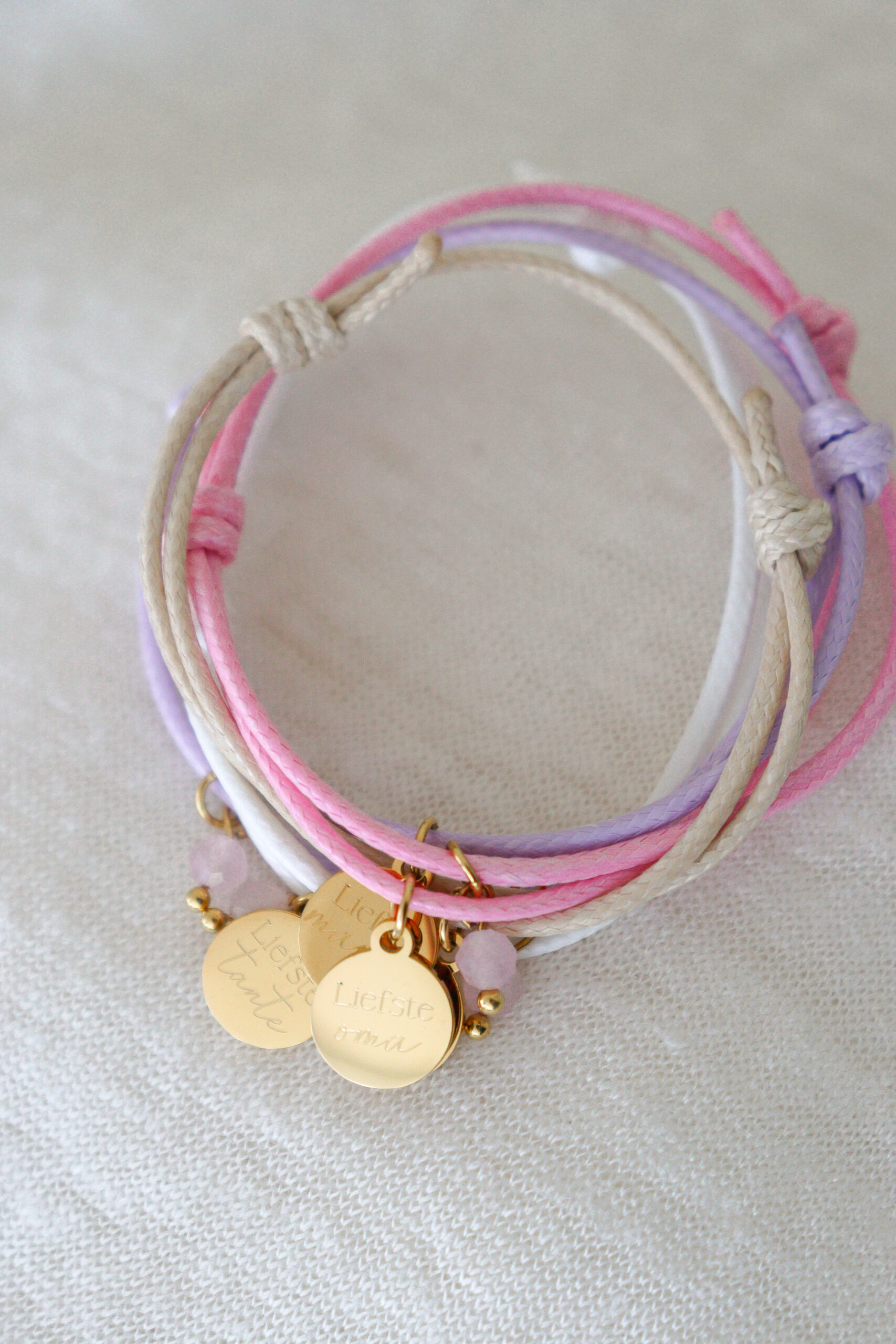 Je kiest zelf uit vier zachte kleuren waxkoord: wit, beige, roze of lila. Daardoor maak je het cadeau nog persoonlijker en passender bij haar smaak.