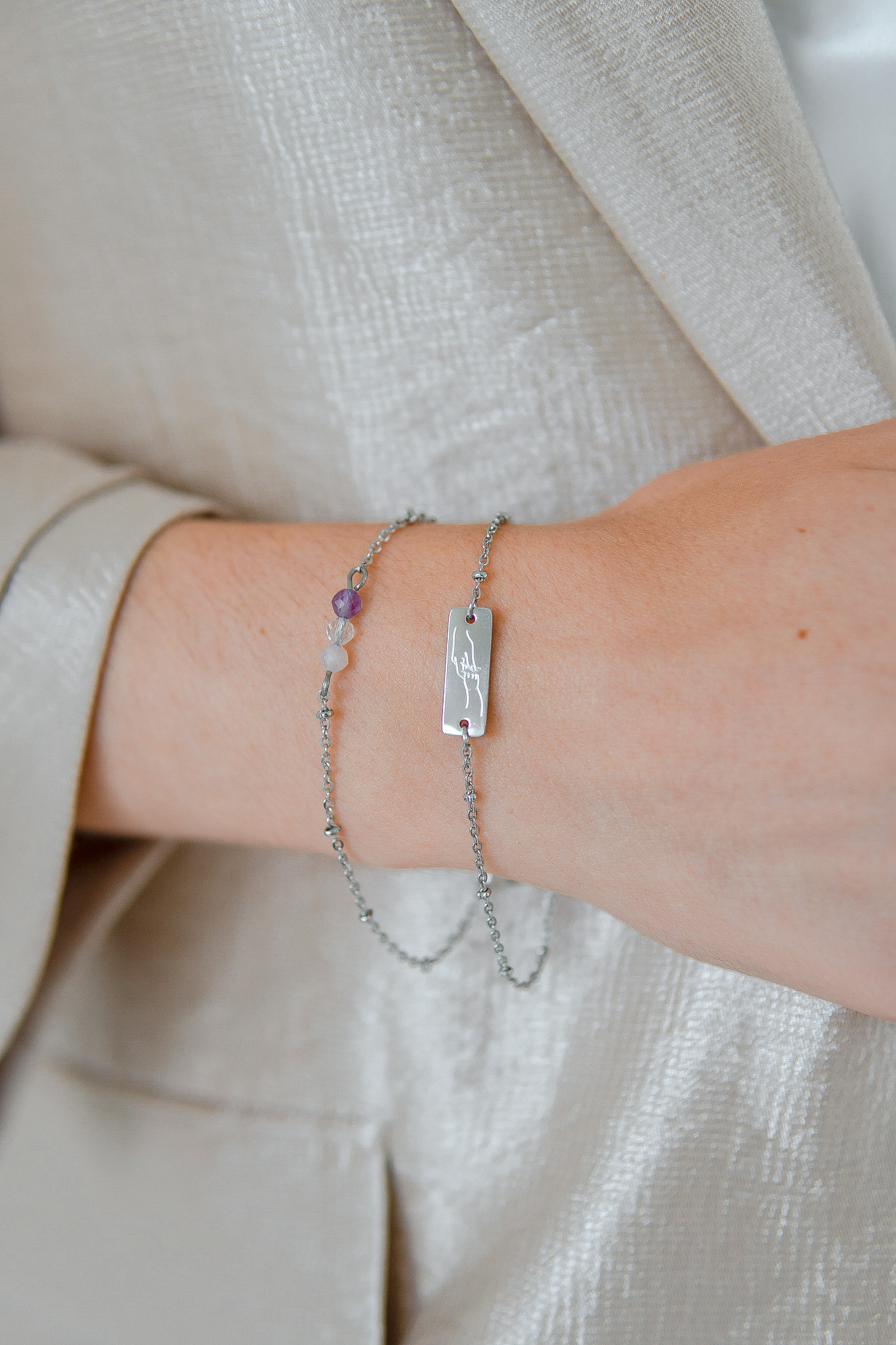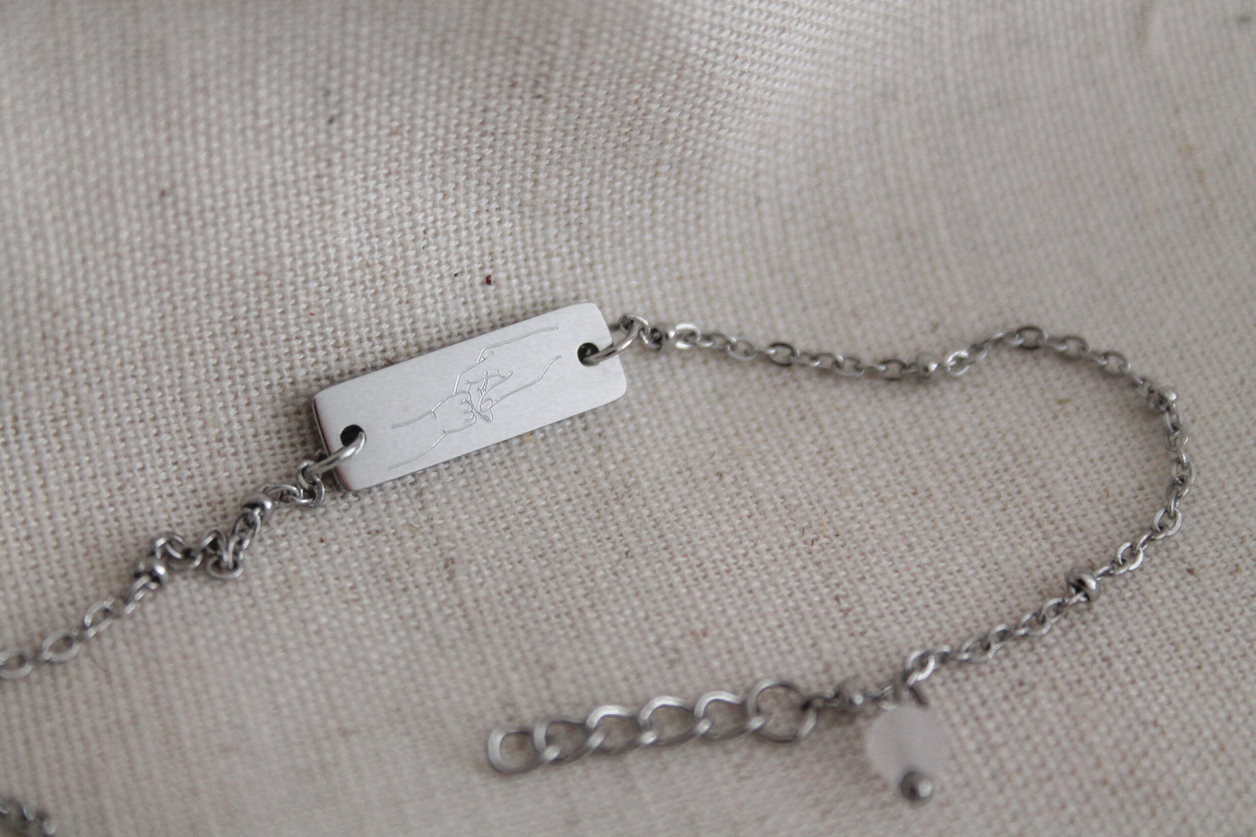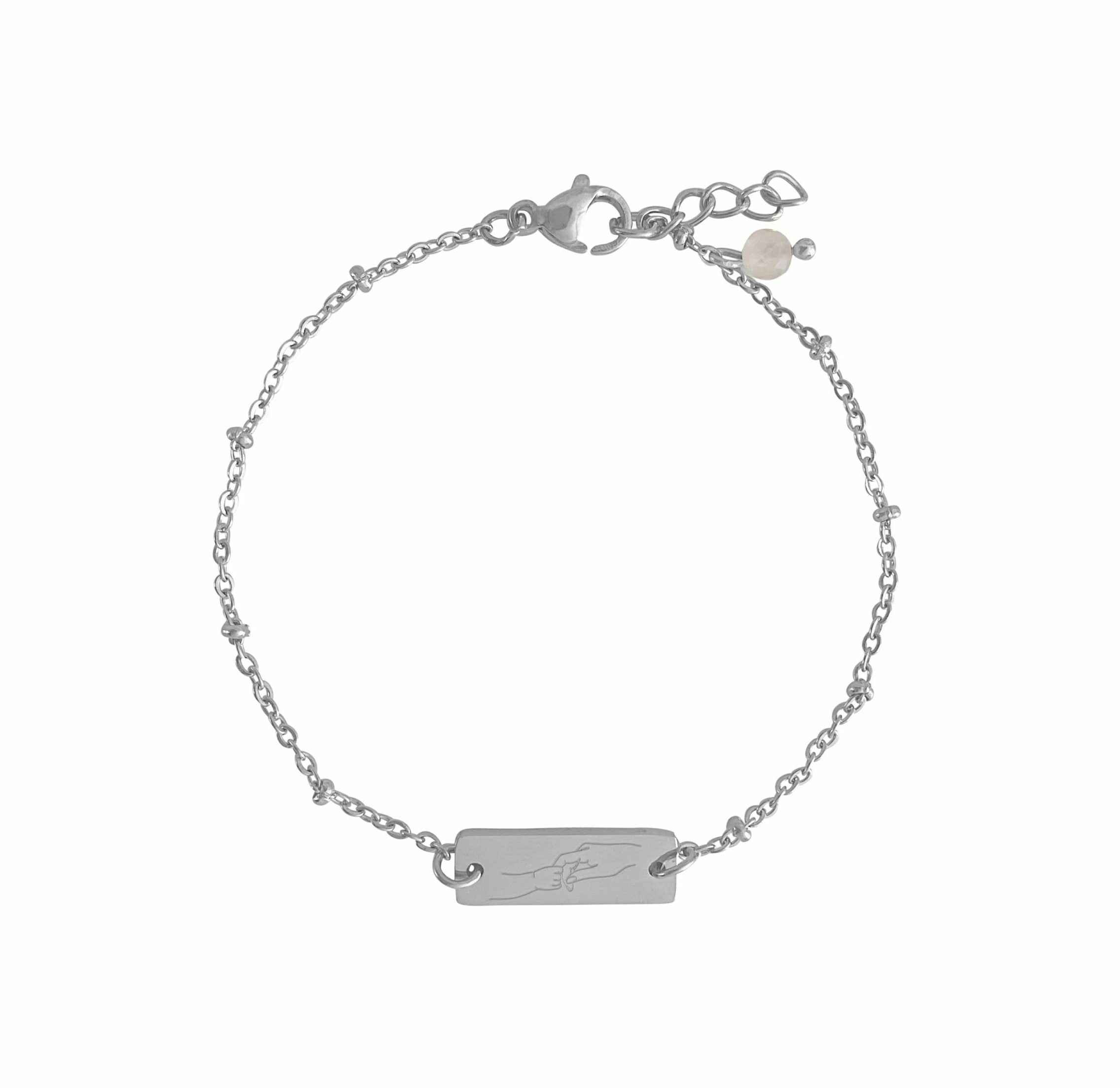 Armband Mama en Kind & Rozenkwarts, gemaakt van stainless steel. Op het armbandje is een handje van een kindje, die de vinger van de mama vast pakt, gegraveerd. Aan het armbandje hangt een Rozenkwarts steentje. Het plaatje is ontworpen en gegraveerd in ons atelier.