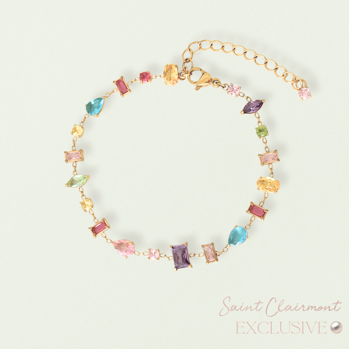 Wat de Meliora armband zo bijzonder maakt, is de subtiele mix van kleuren en vormen. Zachte roze tinten, frisse groene en blauwe accenten en elegante paarse steentjes creëren samen een stijlvolle en vrolijke regenboog van fonkeling. Elke beweging vangt het licht en laat de steentjes sprankelen.
