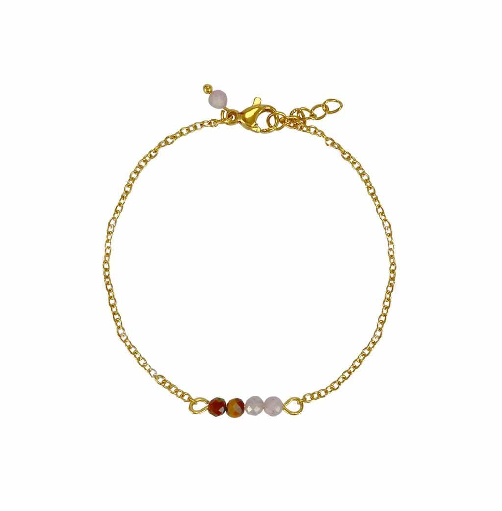 Armband Tijgeroog & Kunziet. De armband is gemaakt van stainless steel met een Tijgeroog & Kunziet steentje. De steentjes zijn facet geslepen, dus glinsteren vanuit elke hoek. Tijgeroog, een warme, goudbruine steen die bekend staat om bescherming en innerlijke kracht, en Kunziet, een zachte roze-violette steen die liefde en emotioneel evenwicht symboliseert.