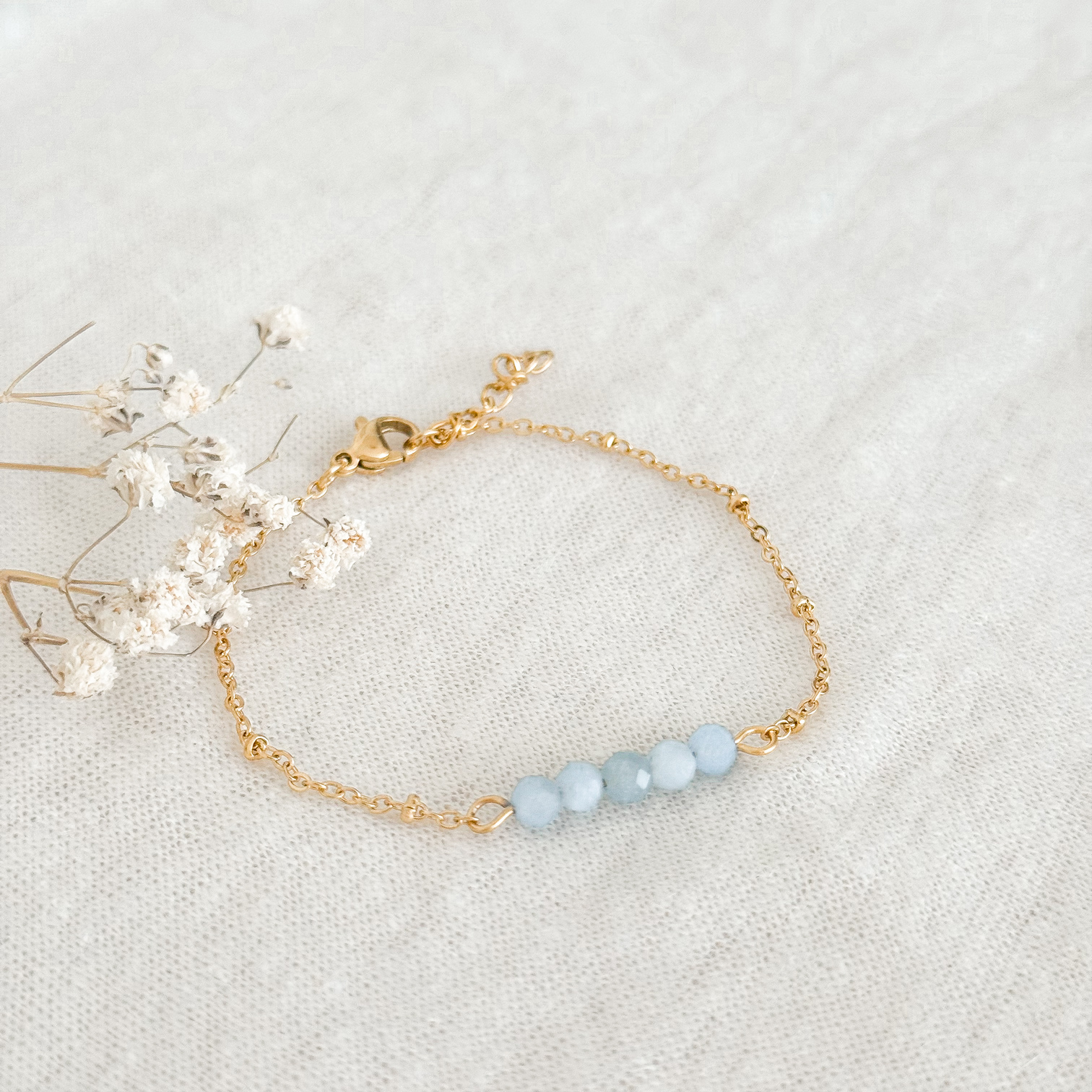 Soms heb je maar een klein detail nodig om je outfit én je energie een boost te geven. Dit minimalistische armbandje met vijf facetgeslepen Aquamarijn steentjes bewijst dat eenvoud ontzettend stijlvol en krachtig kan zijn.
