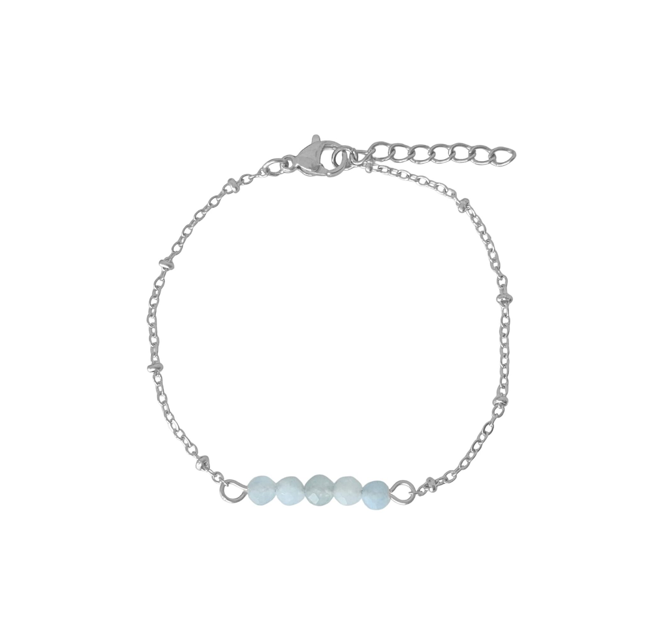 Soms heb je maar een klein detail nodig om je outfit én je energie een boost te geven. Dit minimalistische armbandje met vijf facetgeslepen Aquamarijn steentjes bewijst dat eenvoud ontzettend stijlvol en krachtig kan zijn.