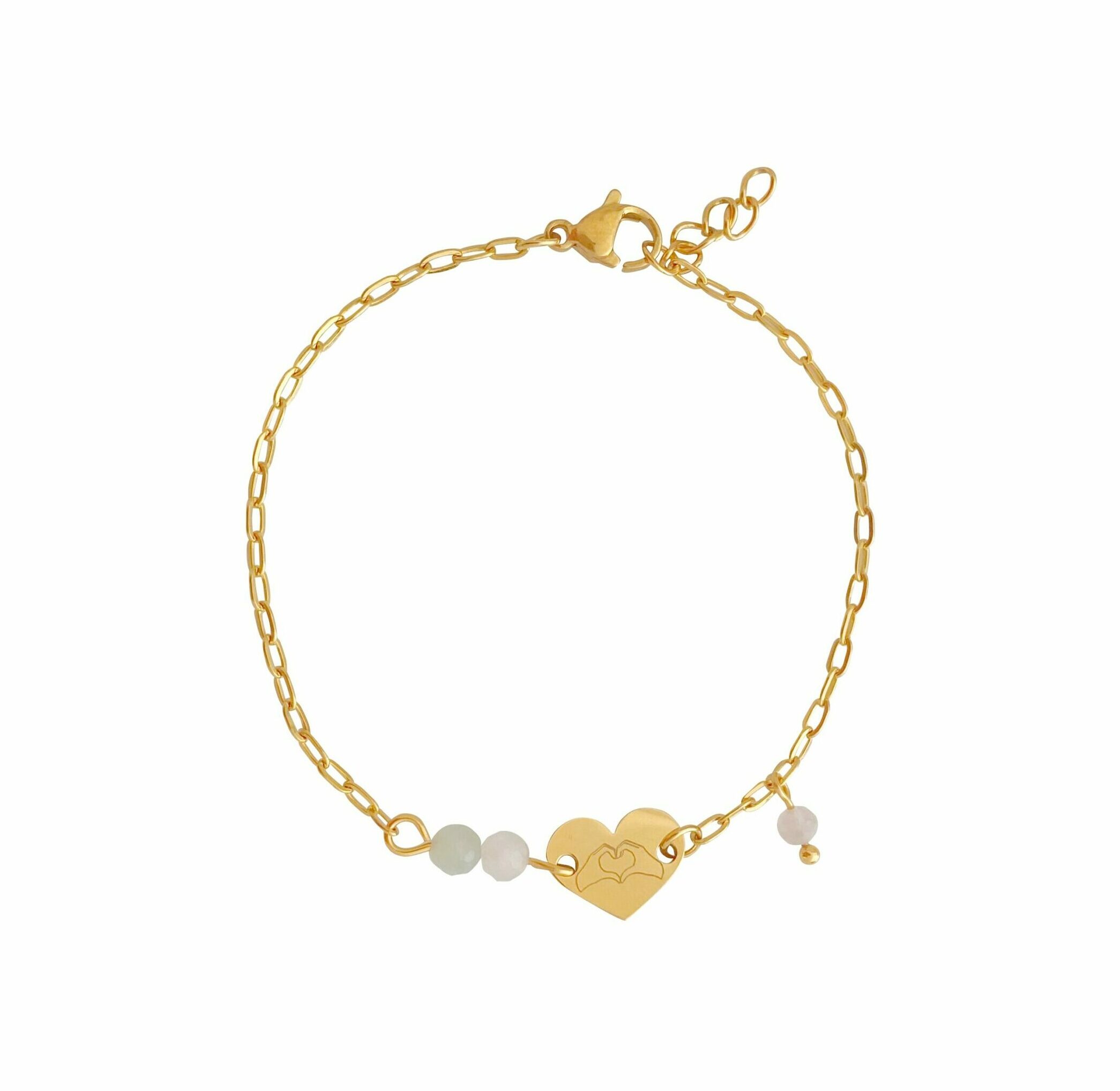 Aan het liefde en support armbandje vind je links van het hartje een Maansteentje en Groene Jade. Aan het kleine hangertje zit een klein Rozenkwarts steentje. Alle edelsteentjes zijn facet geslepen en glinsteren mooi.