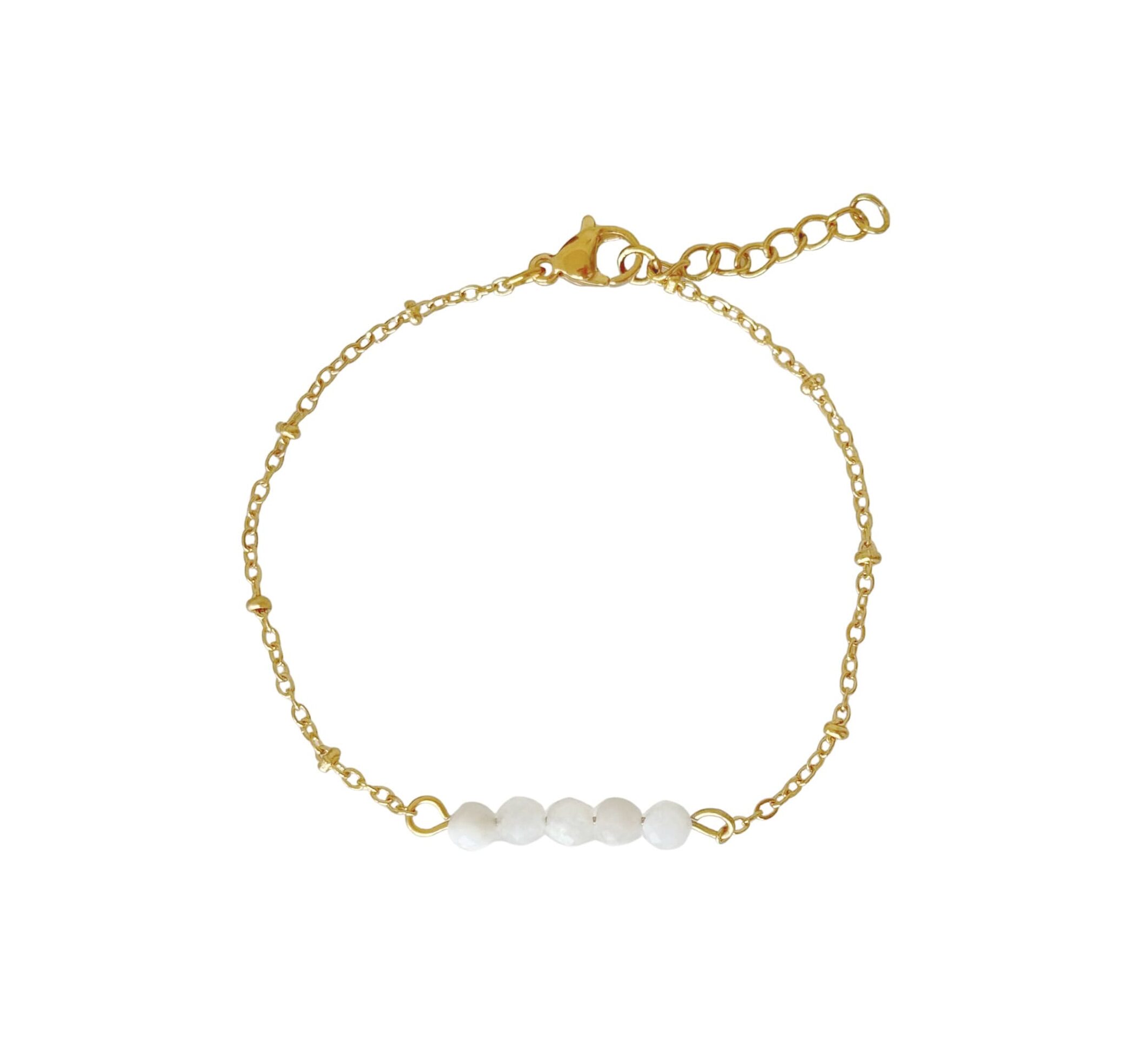Armbandje Maansteen Facet, gemaakt van stainless steel. Deze verfijnde armband bestaat uit vijf facet geslepen Maanstenen. Elk met een zachte glans die doet denken aan het licht van de maan. De steentjes zijn subtiel, maar krachtig, net als de werking van deze bijzondere edelsteen.