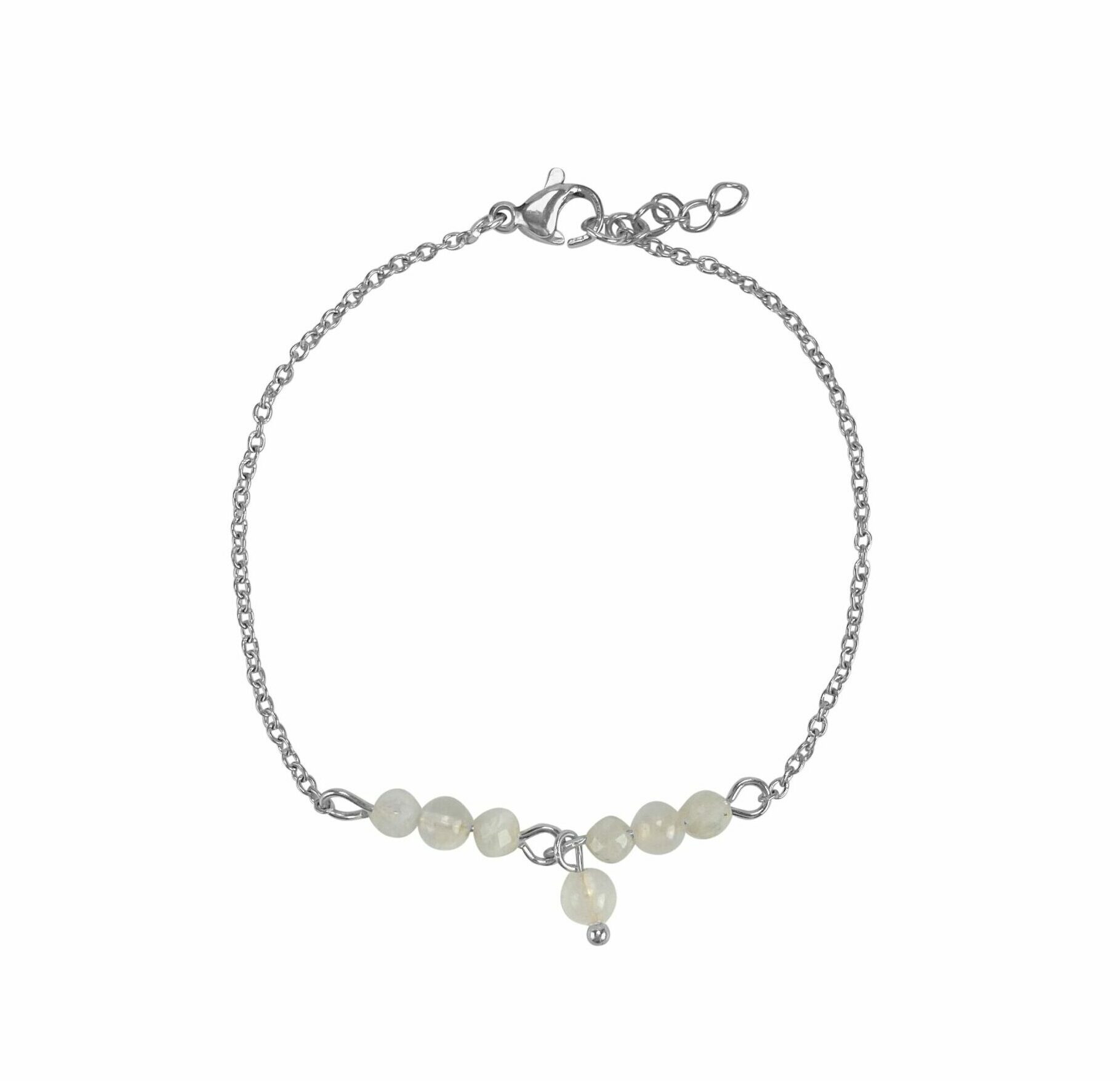Stainless steel armbandje met Maansteen en Jade. De Maansteentjes zijn facet geslepen en de Jade steentjes rond. Het hangertje aan het armbandje is ook een wit Jade steentje.