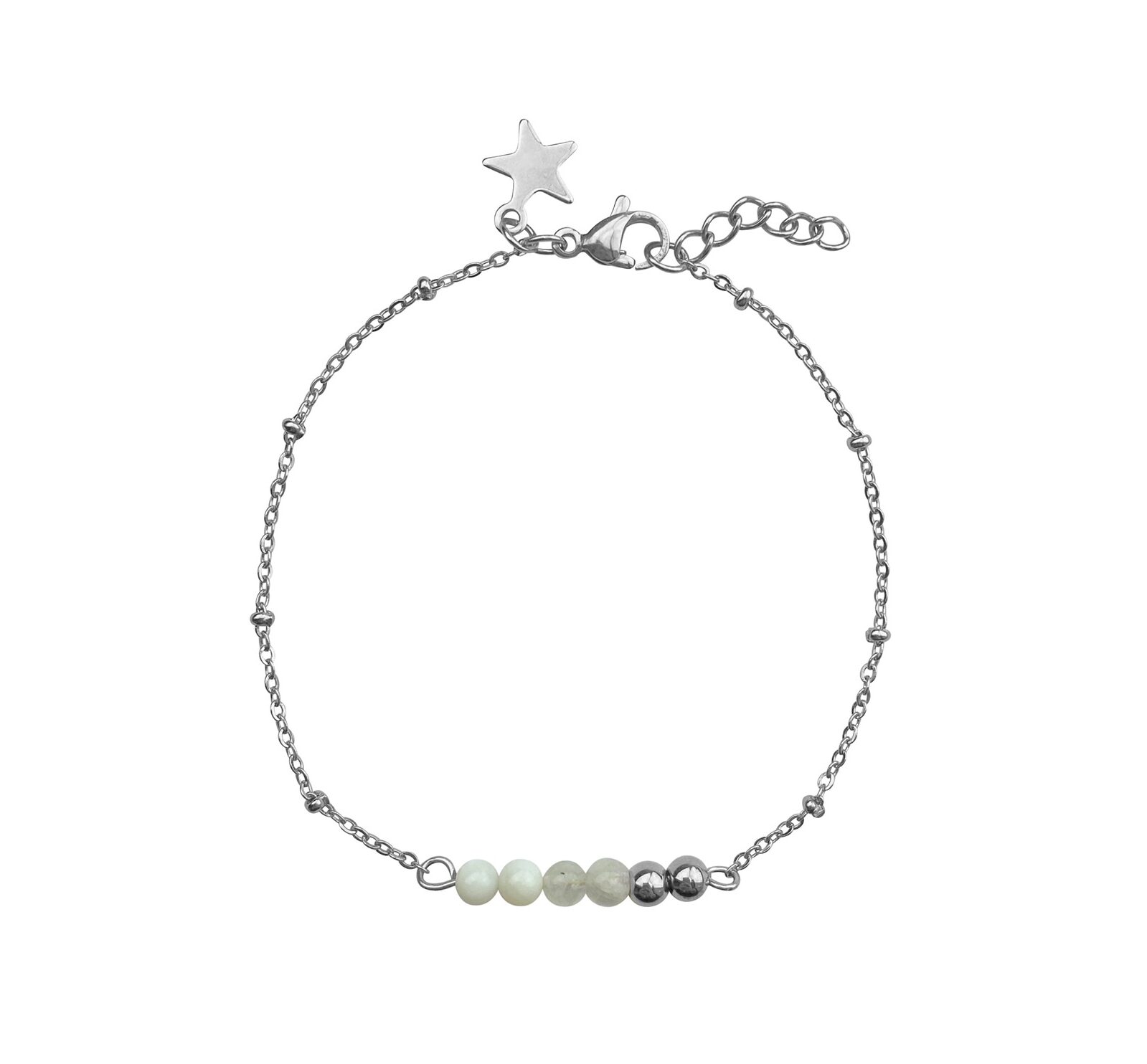 Stainless steel armbandje met 2 schelp kraaltjes, 2 Maansteentjes en 2 kraaltjes gemaakt van stainless steel. Bij het slotje hangt een ster bedeltje.