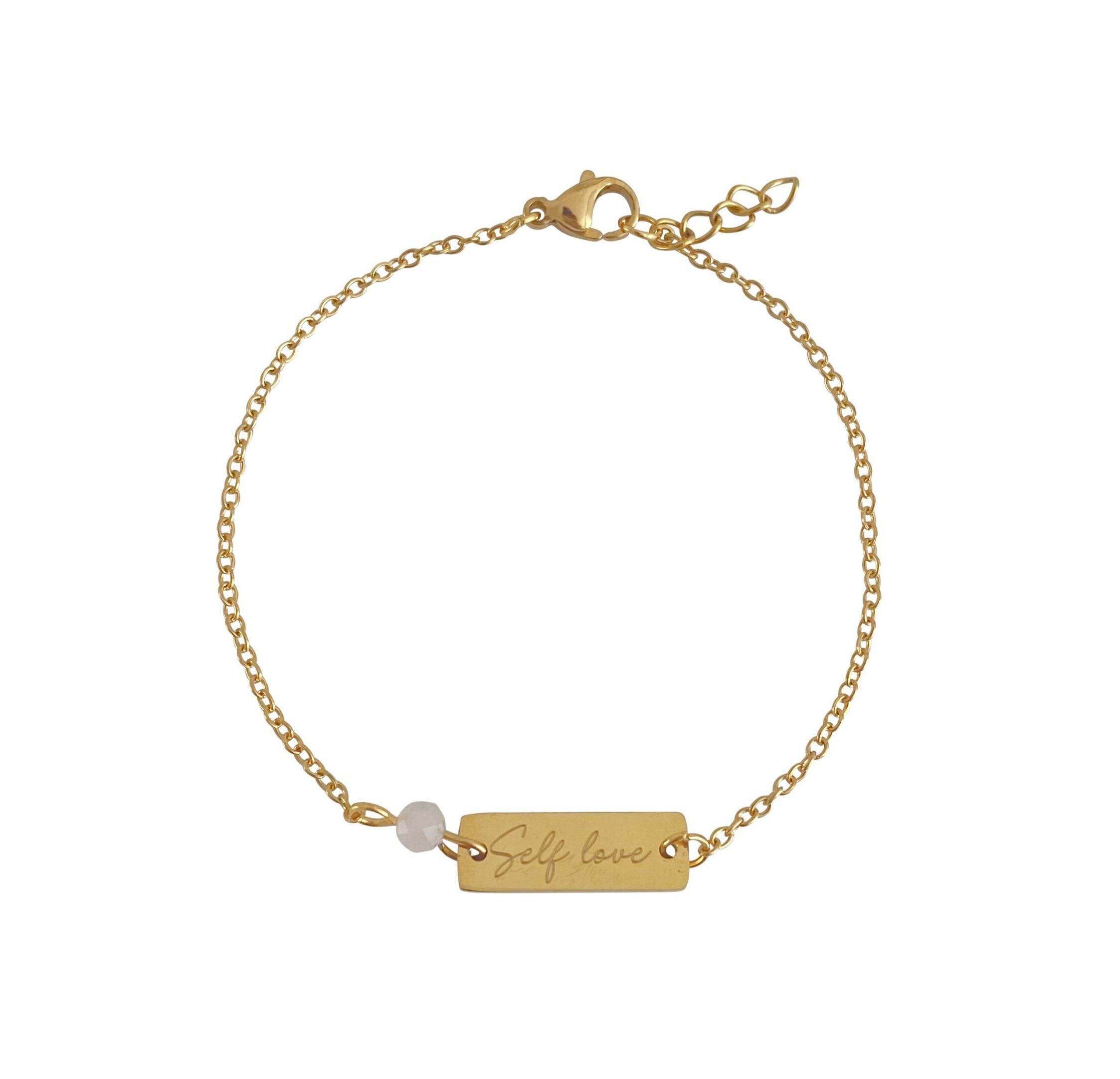 Stainless steel armbandje met een Rozenkwarts steentje en een plaatje met daar op "Self Love" gegraveerd. Het plaatje is ontworpen en gegraveerd in ons eigen atelier.