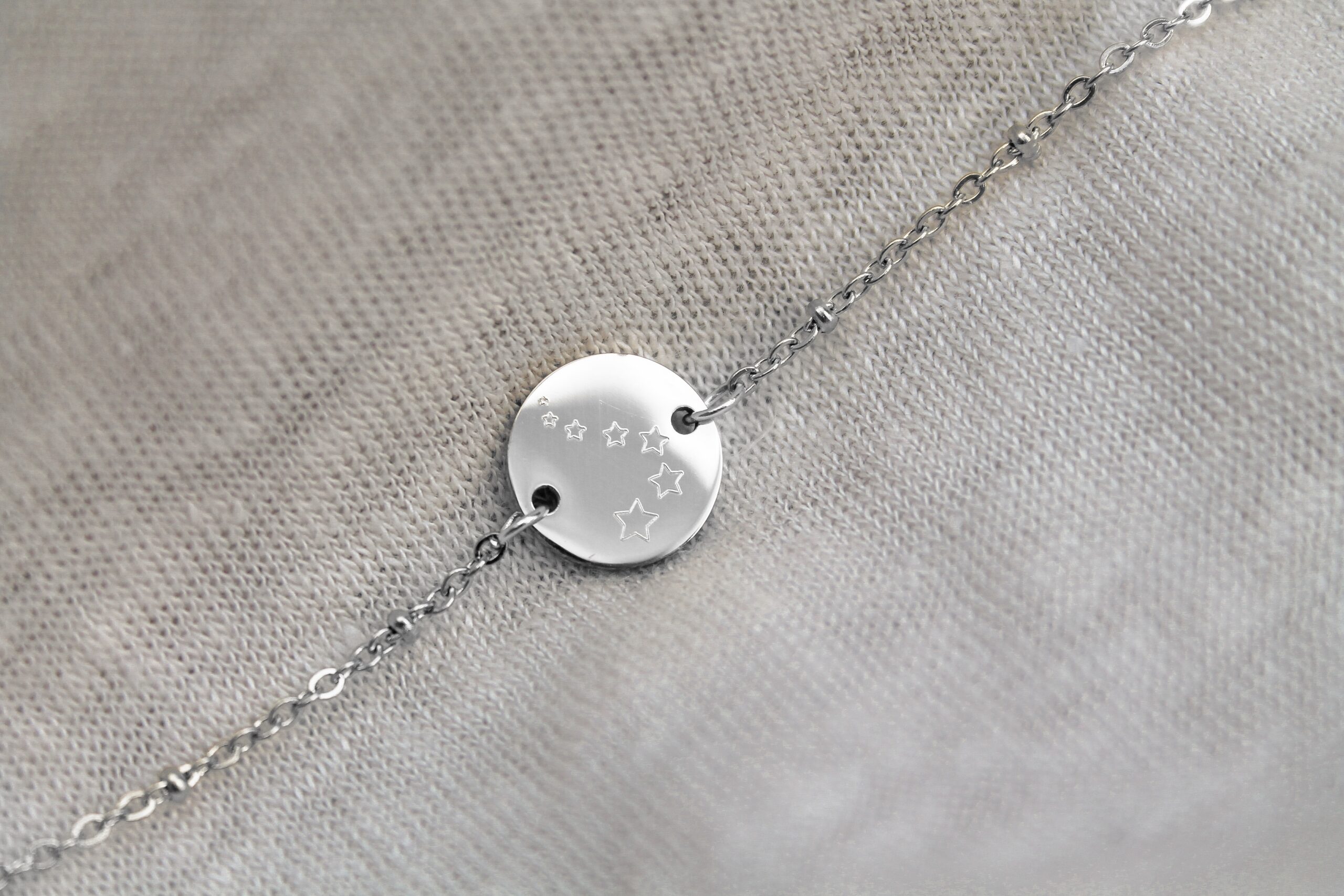 Armbandje Sterrenkindje Troostgeschenk, gemaakt van stainless steel. Op het bedeltje zijn kleine sterretjes gegraveerd. Wij graveren en maken het armbandje in ons eigen atelier. Een troostgeschenk, voor wanneer woorden te kort schieten.