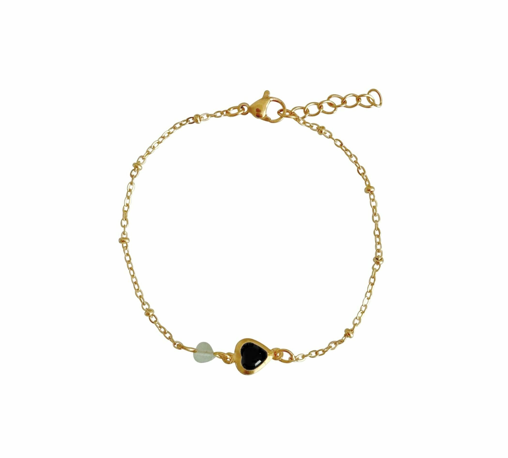 Aventurijn & Kristal Hartje Armband, gemaakt van stainless steel. Het Aventurijn steentje heeft de vorm van een hartje. Het zwarte hartje heeft een mooie schittering en is gemaakt van kristal glas. Dit subtiele armbandje laat jouw outfit extra schitteren!