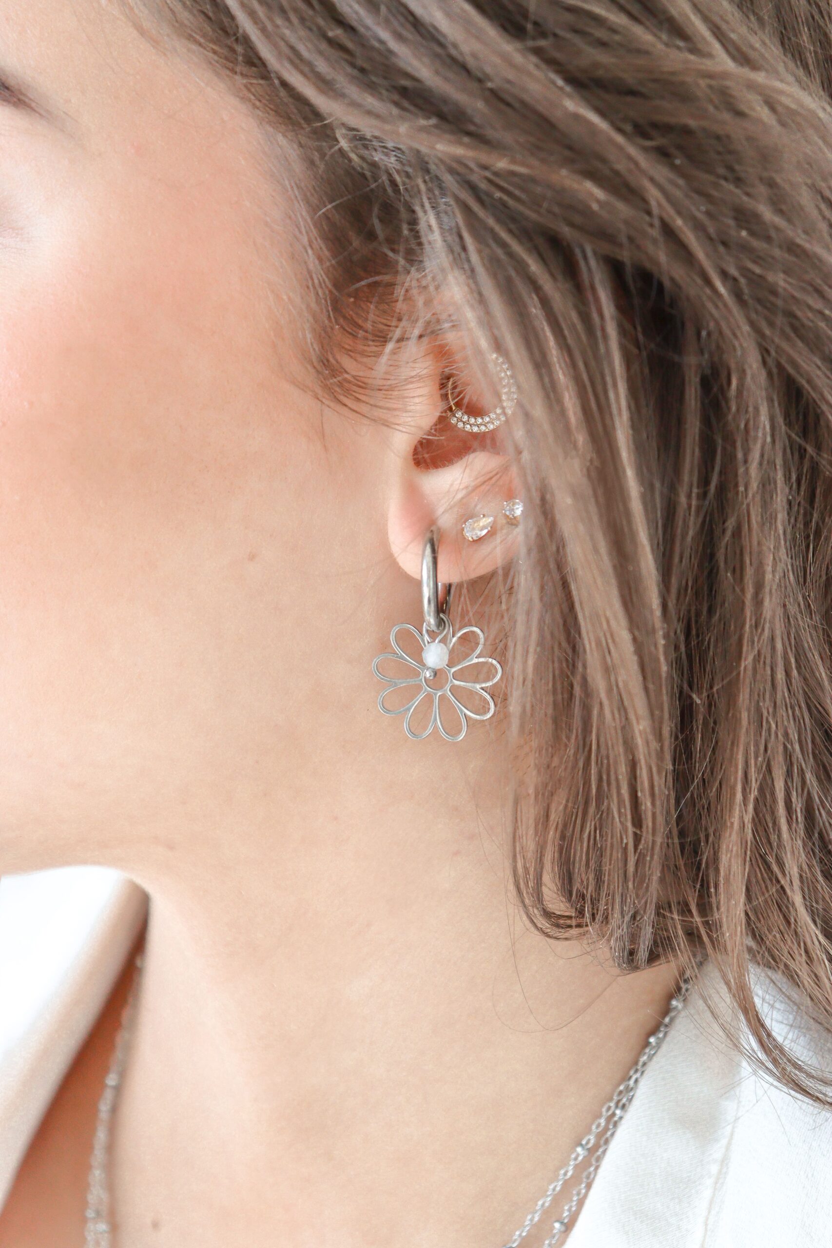 De bloemvormige hanger heeft negen blaadjes en lijkt op een madelief. Bloemen staan vaak symbool voor nieuw begin, positiviteit en lichtheid. De speelse vorm geeft de oorringen een frisse uitstraling en maakt ze makkelijk te combineren, zowel casual als feestelijk.
