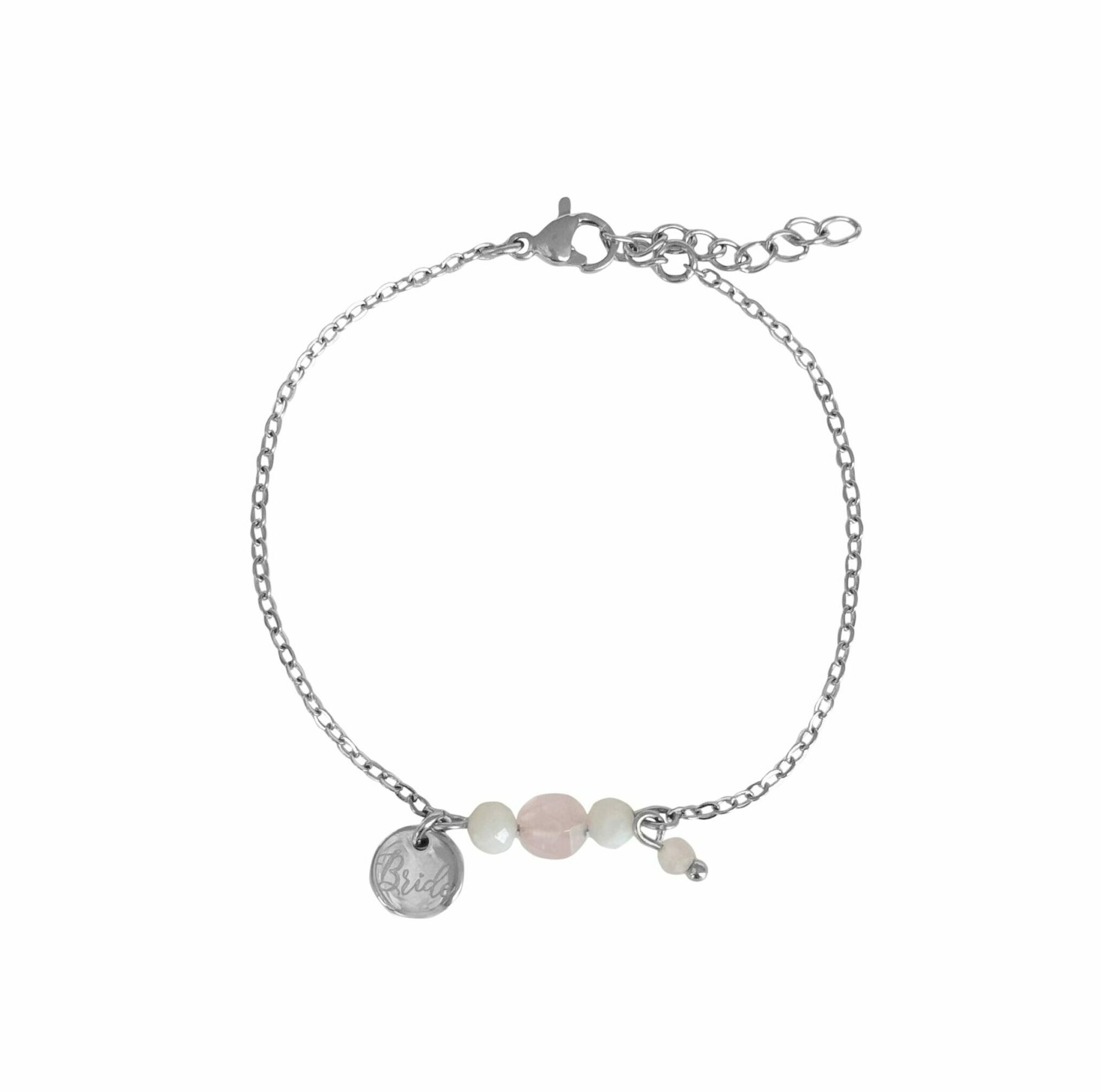 Bruids Armband Rozenkwarts & Maansteen, gemaakt van stainless steel. Op het kleine bedeltje is het woord "Bride" gegraveerd. De edelsteentjes aan de armband zijn facet geslepen en hebben hierdoor een chique uitstraling. Een stijlvolle bruids armband is niet alleen een prachtig accessoire voor je trouwdag, maar ook een waardevol aandenken die je kunt blijven dragen. Elke keer dat je de armband draagt, denk je terug aan die speciale dag en de belofte van eeuwige liefde. Omdat de armband gemaakt is van stainless steel, is de armband sterk, kleurvast en duurzaam.