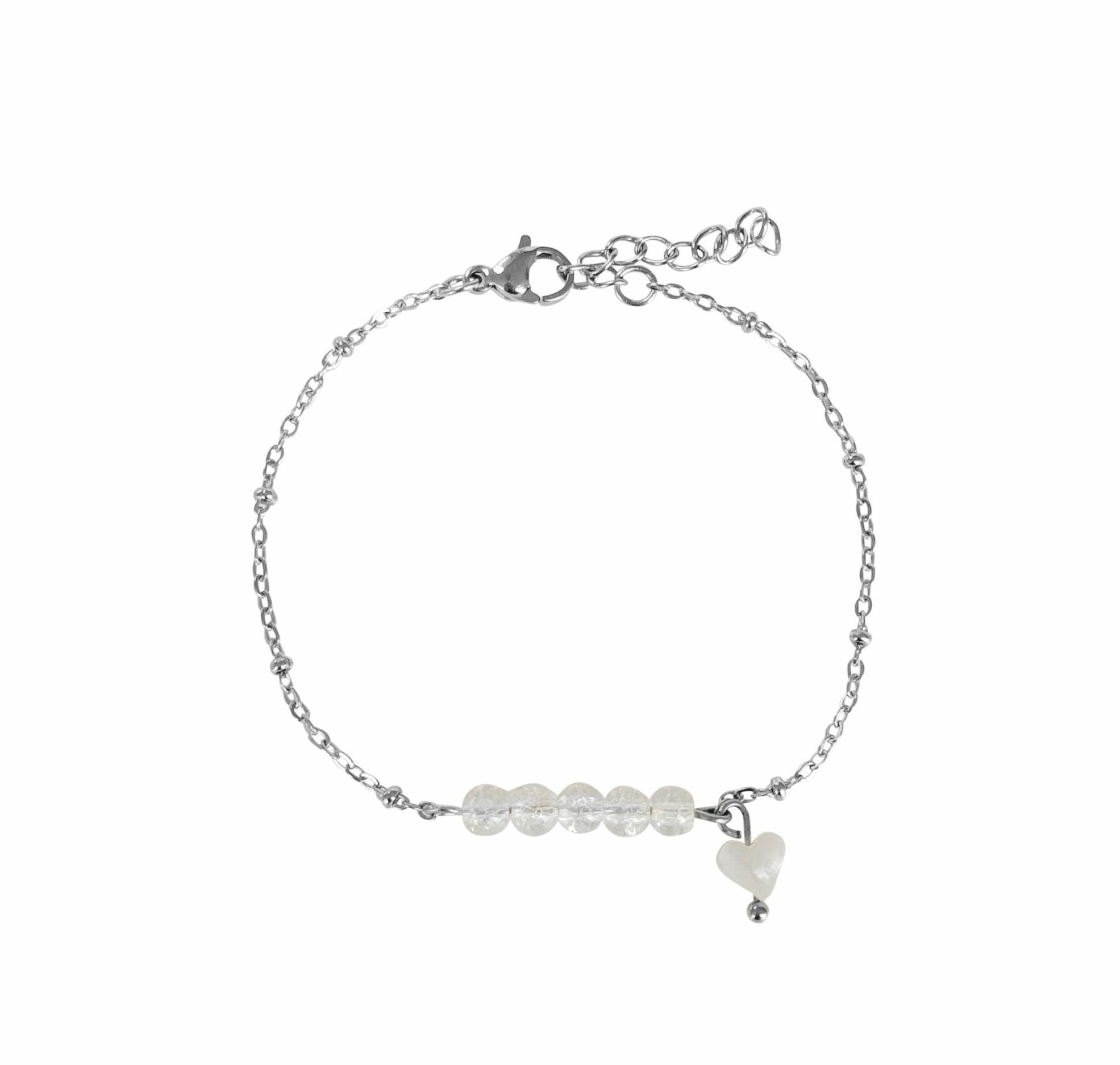 Cracked Bergkristal & Hartje Armband, gemaakt van stainless steel. Aan het armbandje vind je vijf Bergkristal steentjes en een schelp hartje. Het hartje heeft een mooie parelmoer glans.