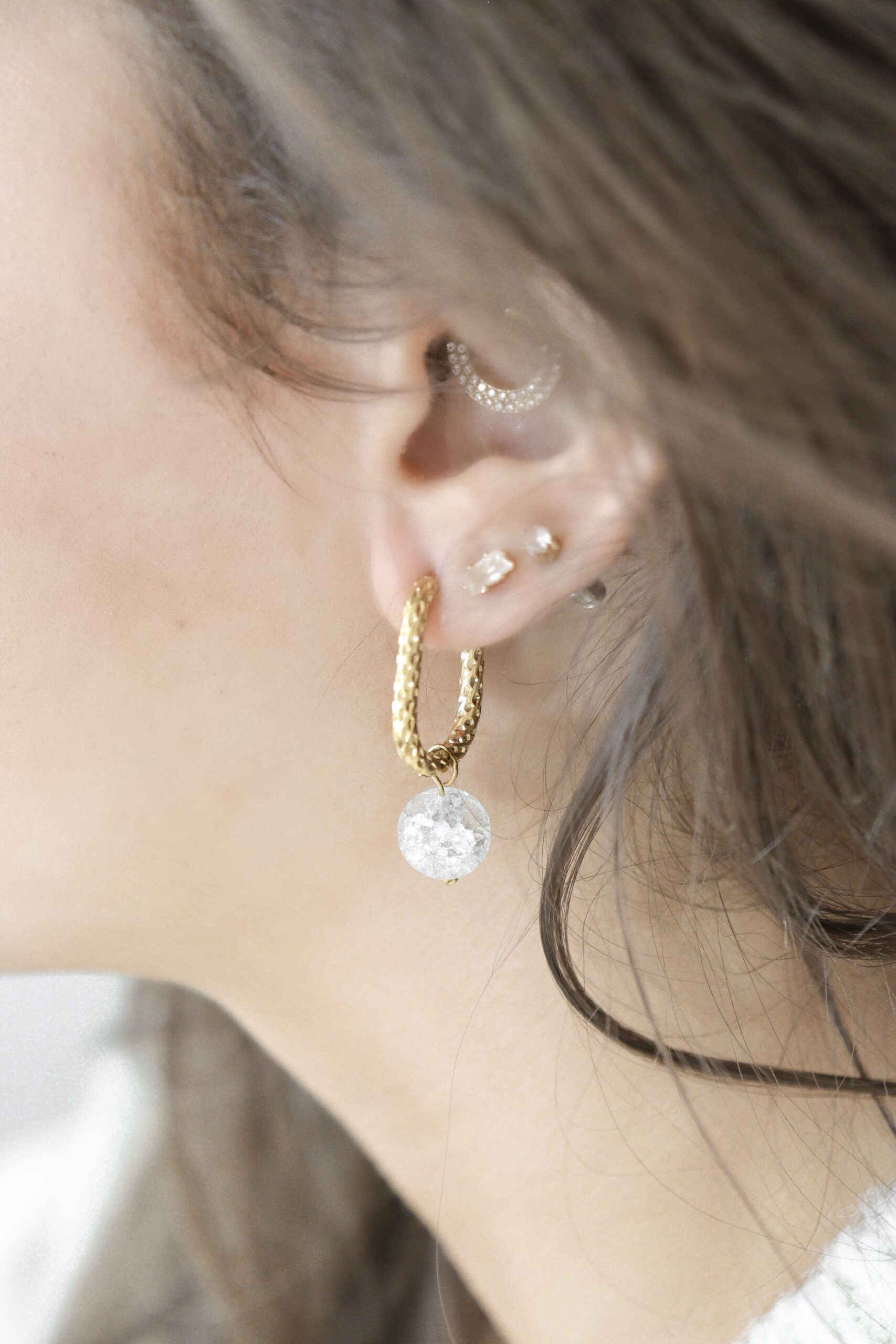 Cracked Bergkristal Oorringen, gemaakt van stainless steel. De Bergkristal stenen hebben door de gebarsten patroontjes een unieke look. De oorringen zijn perfect voor feestelijke gelegenheden, zoals Kerstmis, of juist om te dragen op jouw bruiloft!