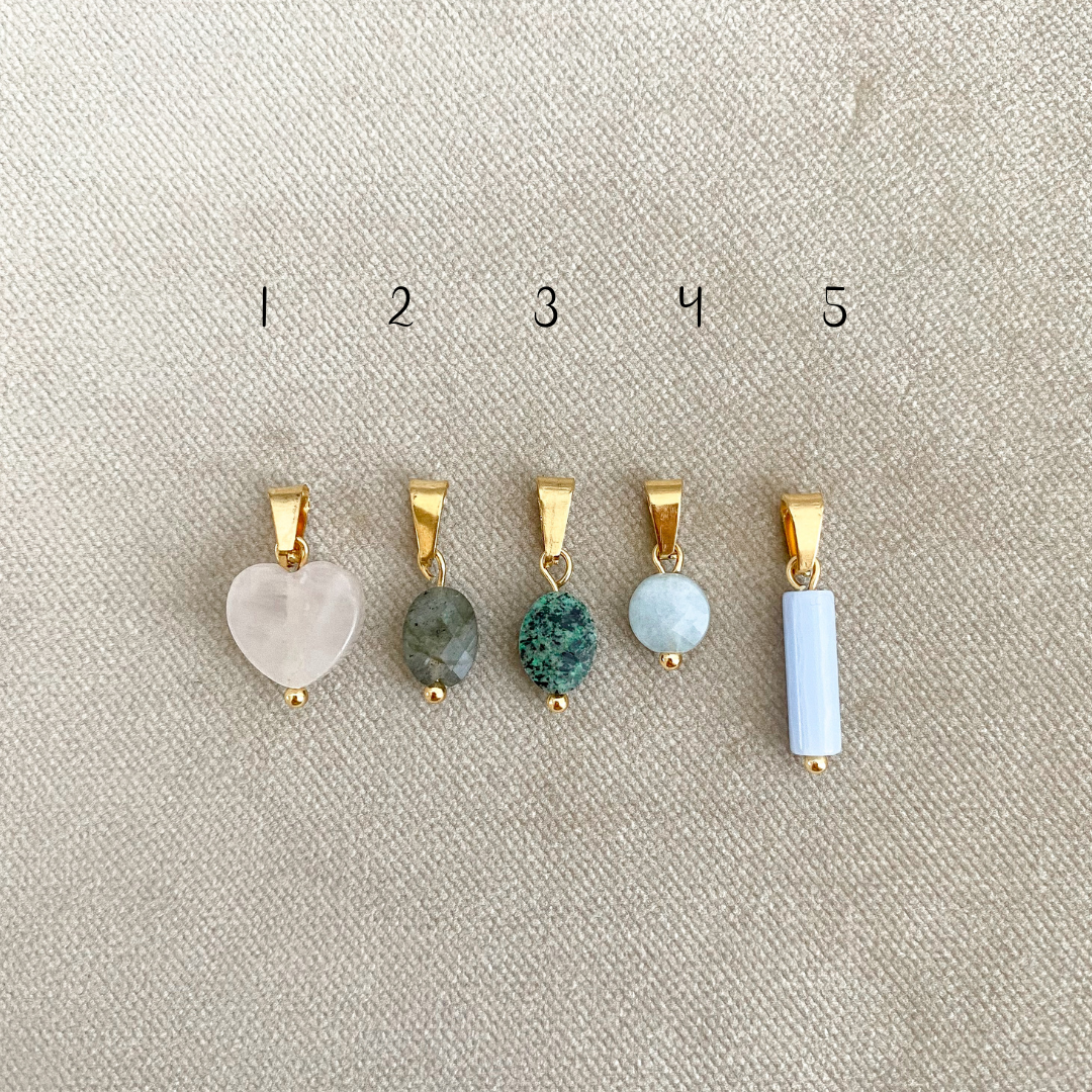 Edelsteen ketting hangers. Draag elke dag de hanger die het beste met je resoneert. Door de handige schuifjes kun je makkelijk de hanger van je ketting af schuiven en er weer een andere aan hangen. Wil je de edelstenen graag aan een oorring of onze Mix & Match ketting hangen? Kies dan voor een ringetje.