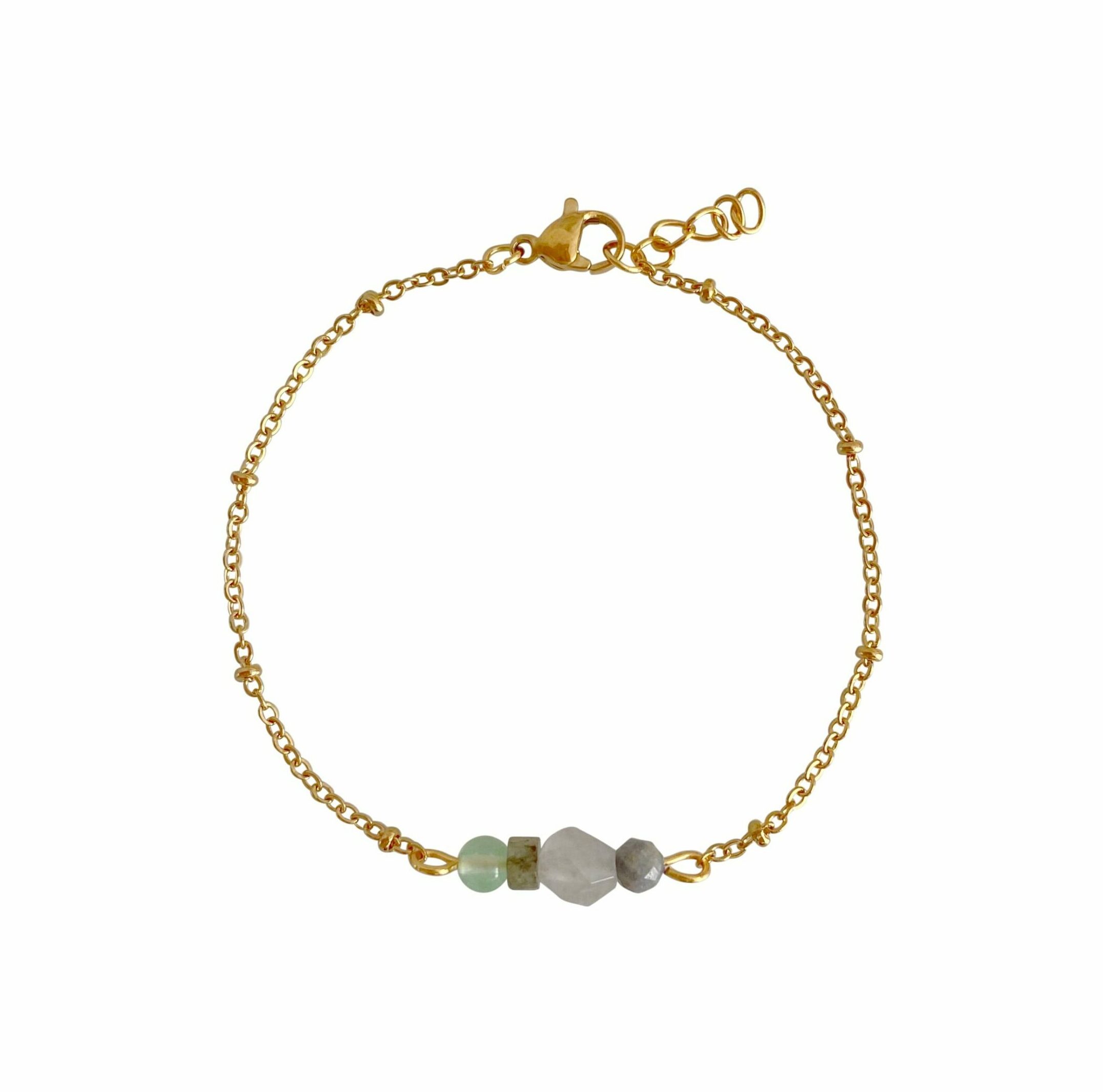 Edelstenen kracht armband. Aan de armband vind je van links naar rechts, Jade, Labradoriet, Agaat en Saffier. De Agaat en Saffier zijn facet geslepen en fonkelen mooi. De edelstenen kracht armband is gemaakt van stainless steel, net als de rest van alle sieraden in de collectie.