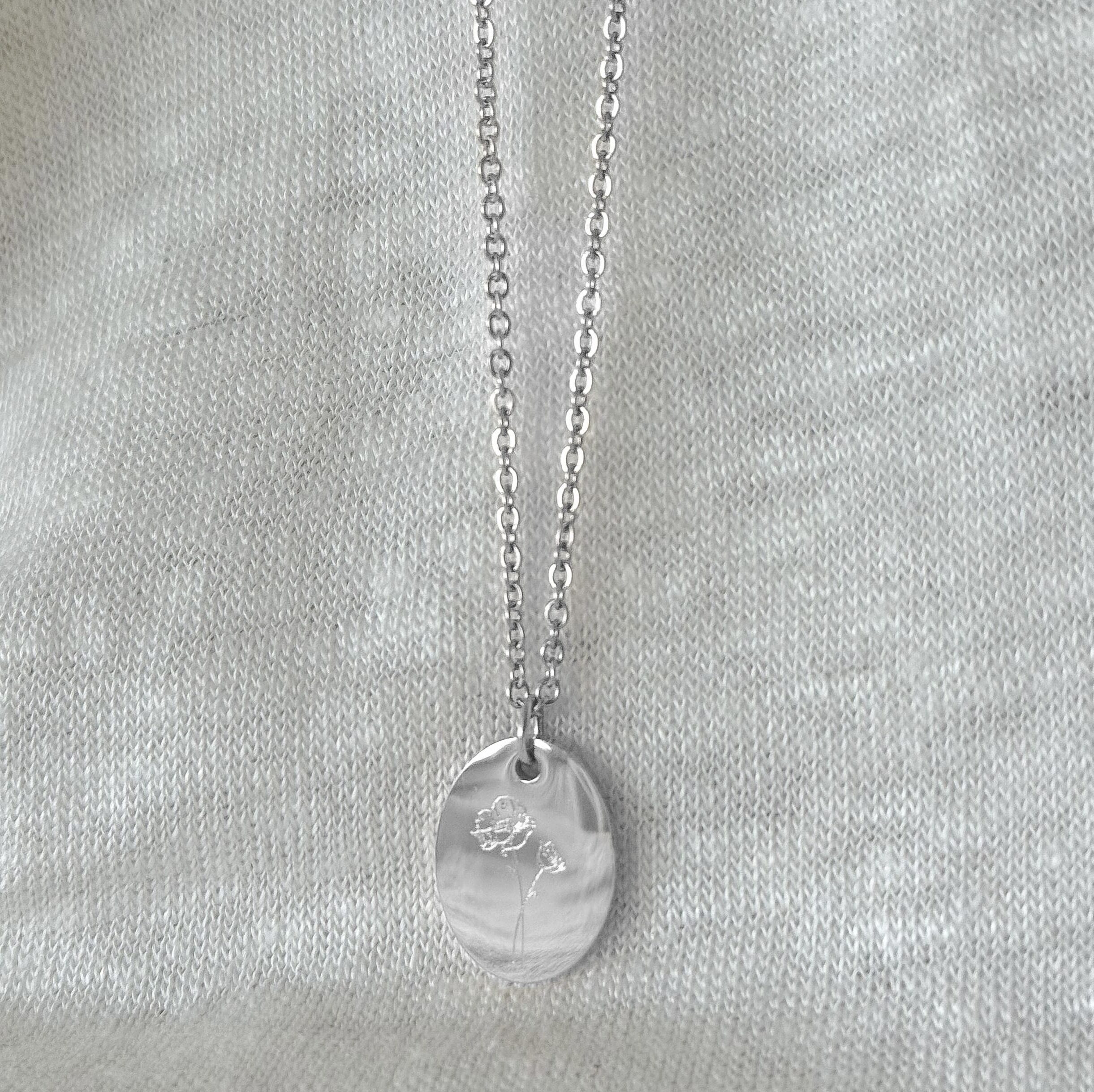 Geboortebloem Ketting Ovaal, gemaakt van stainless steel. Ontdek onze nieuwste variant van de geliefde geboortebloem ketting: nu met een elegante ovaalvormige hanger. Deze geboortebloem ketting combineert een tijdloos design met een persoonlijke betekenis, perfect voor elke dag én speciale momenten.