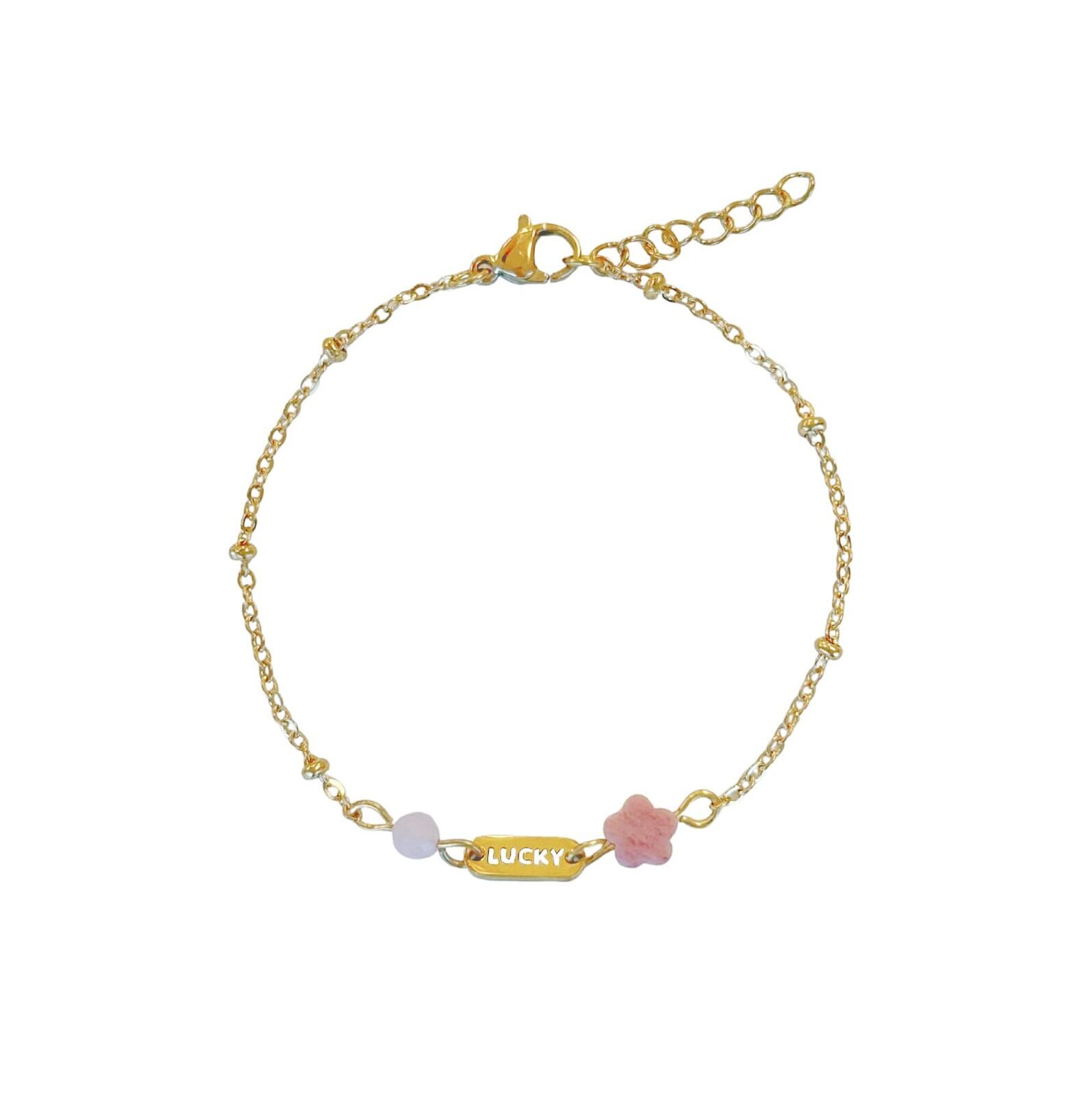 Geluksarmbandje Rhodochrosiet & Rozenkwarts, gemaakt van stainless steel. Dit verfijnde geluksarmbandje is een liefdevol en betekenisvol sieraad dat staat voor geluk, liefde en positieve energie. De armband is afgewerkt met een goudkleurig “Lucky” bedeltje, een zachte rozenkwarts kraal en een bloemvormig rhodochrosiet steentje, wat symbool staat voor groei, bloei en emotionele heling.
