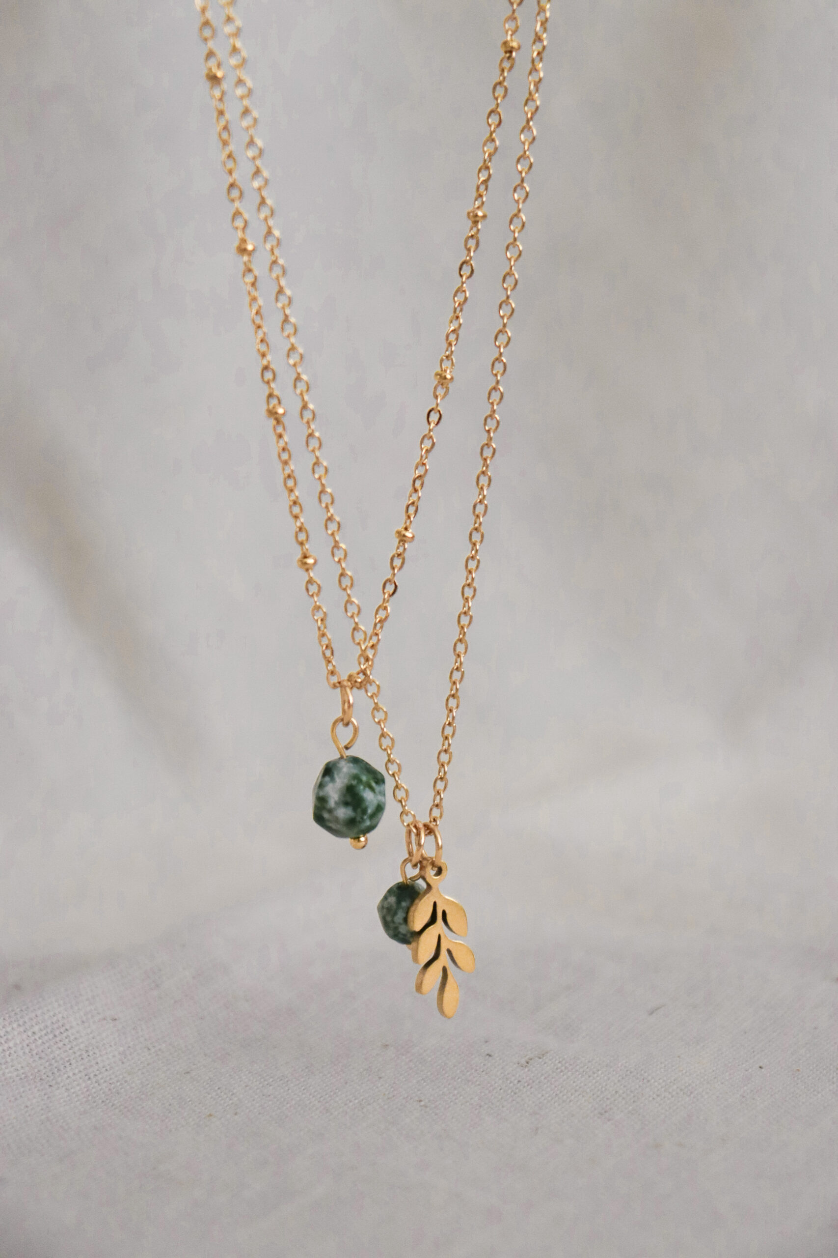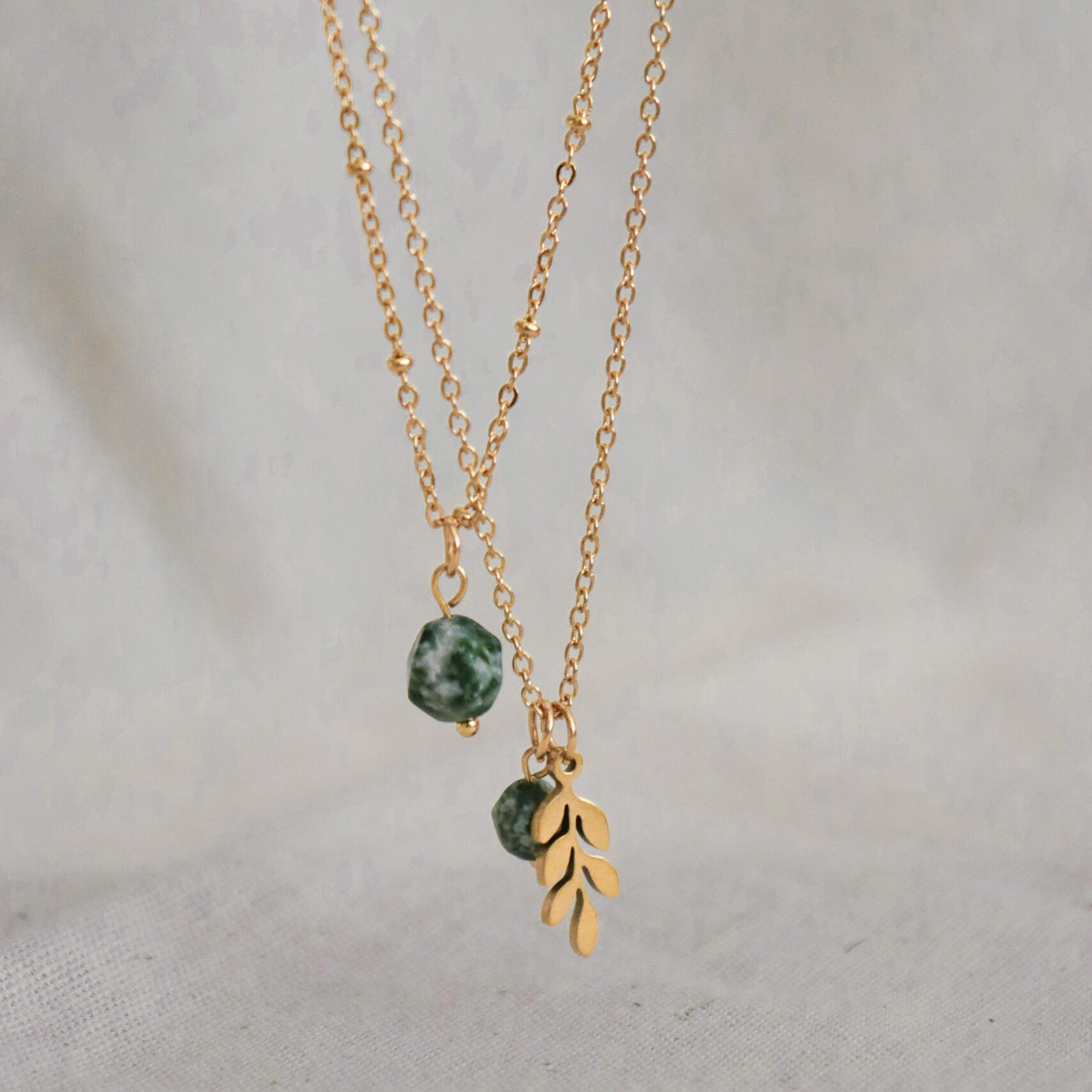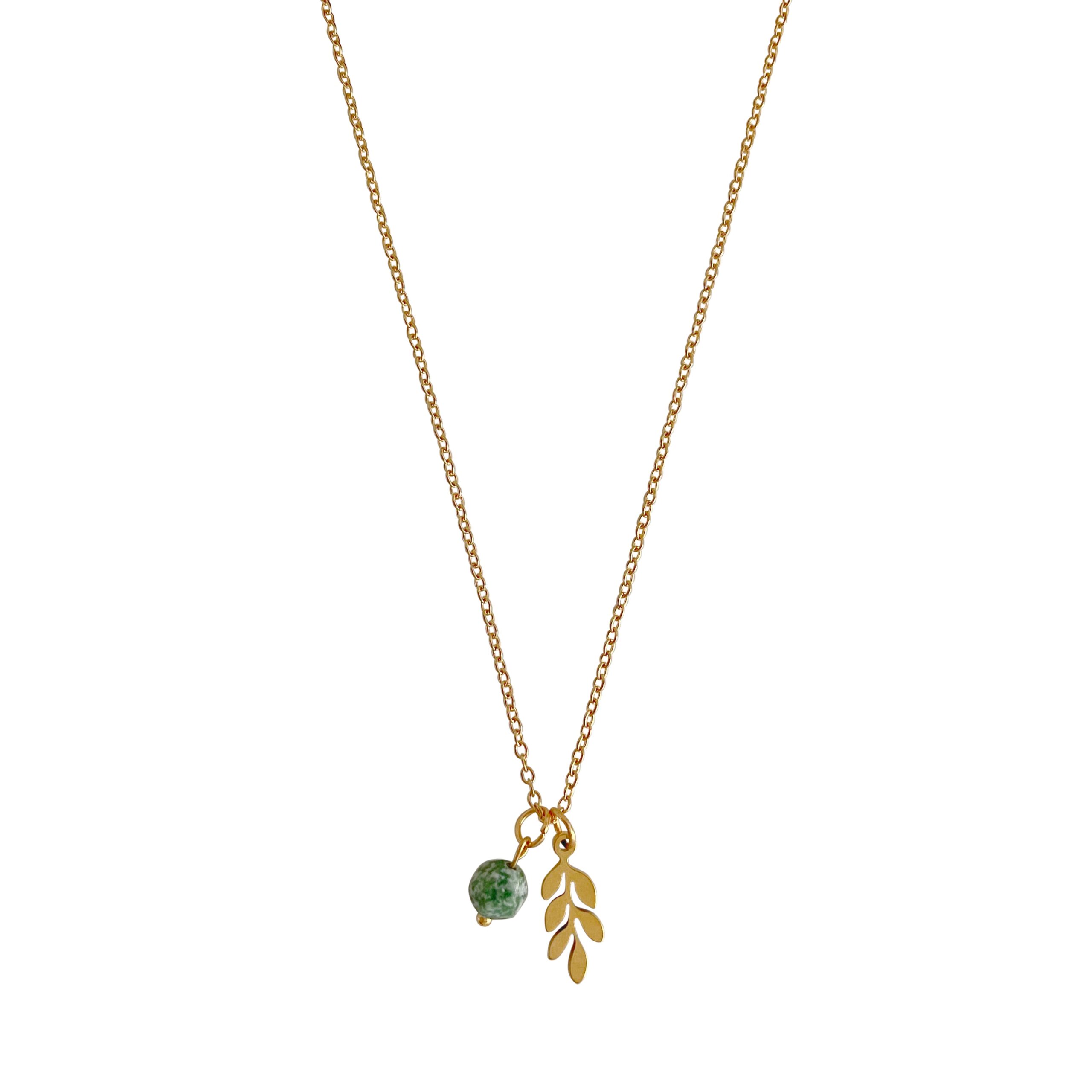 Green Spot Jaspis & Blaadje ketting, de ketting die staat voor kracht en moed. Green Spot Jaspis is een steen die evenwicht brengt en staat bekend als de vernieuwingssteen. Heb je hulp nodig met beslissingen maken of daadkrachtig zijn? Dan is de Green Spot Jaspis & Blaadje ketting een goede voor jou! De ketting is gemaakt van stainless steel.