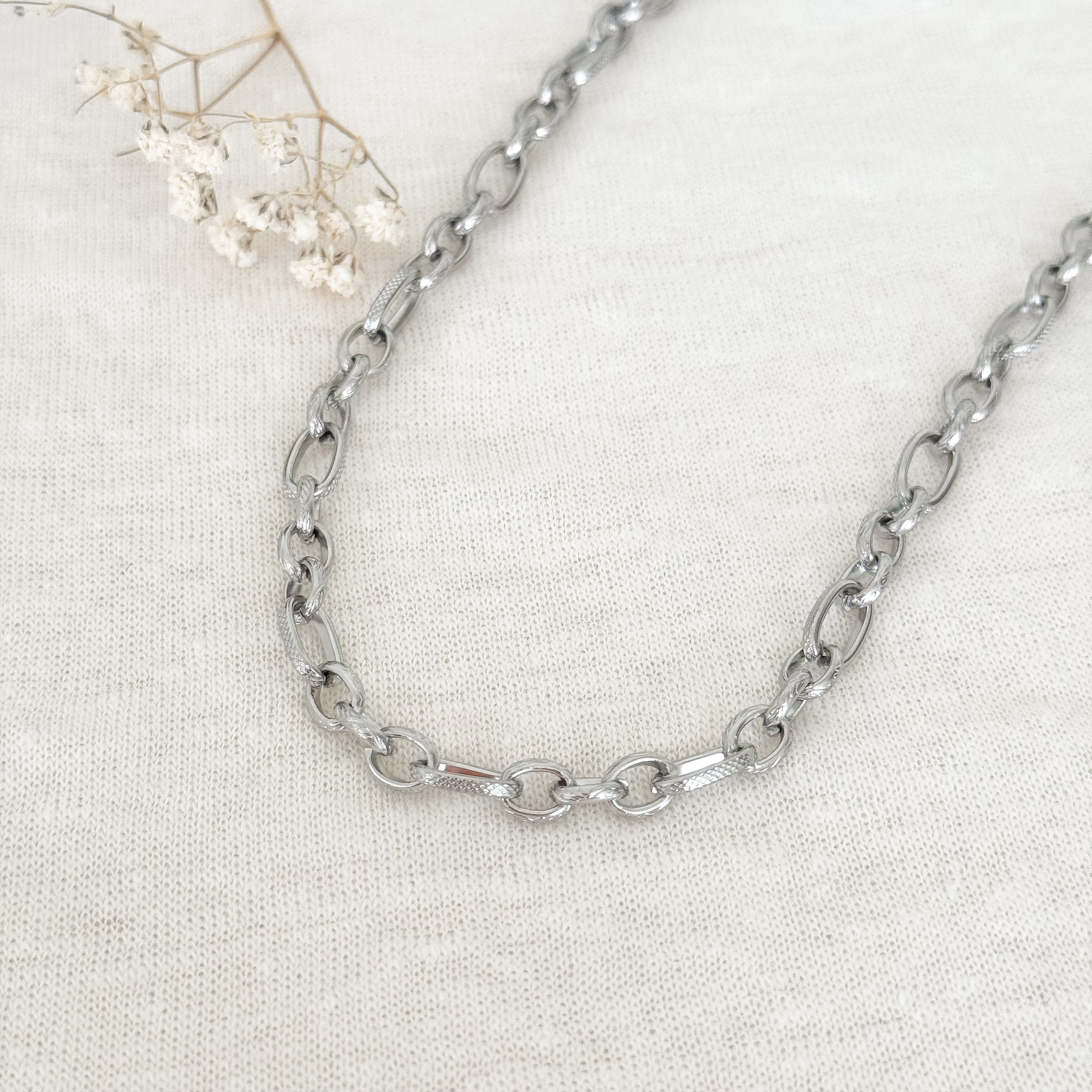 Grove Schakel Ketting, gemaakt van stainless steel. Deze ketting is gemaakt van hoogwaardig stainless steel: duurzaam, kleurvast en hypoallergeen. Wat haar direct opvallend maakt, is de unieke schakelstructuur. De grove ovalen schakels wisselen in grootte en oppervlak. Van glad tot fijn bewerkt, wat zorgt voor een speels, luxueus effect. Elke schakel vertelt haar eigen verhaal en samen vormen ze een krachtig geheel.