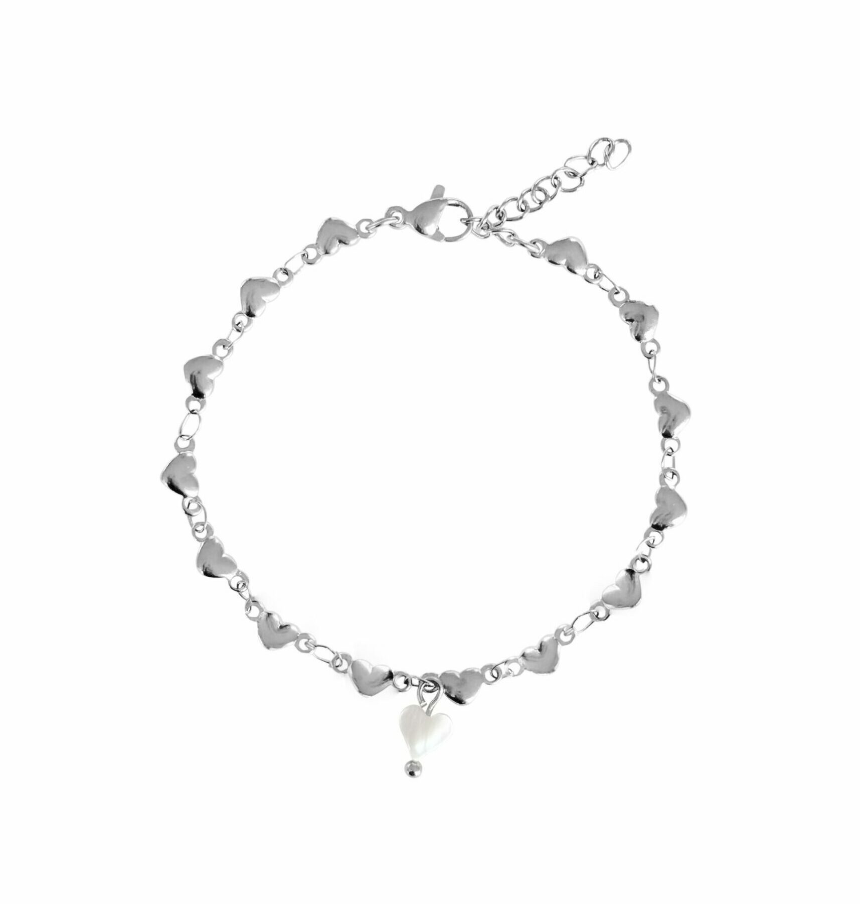 Hartjes armband, gemaakt van stainless steel. Naast dat de schakel kleine hartjes heeft, hangt er ook een klein schelp hartje aan de armband. Het schelp hartje heeft een mooie parelmoer glans. Het delicate ontwerp van hartjes die oneindig verbonden zijn, symboliseert liefde en verbondenheid.