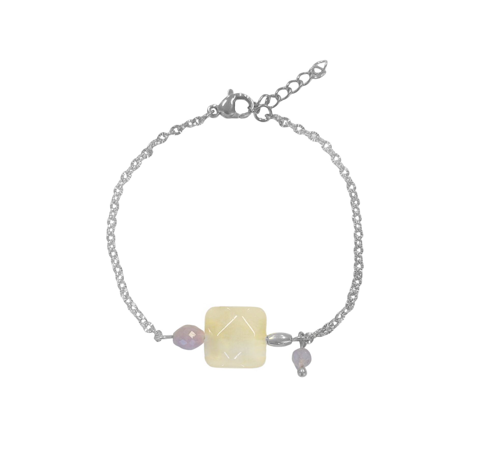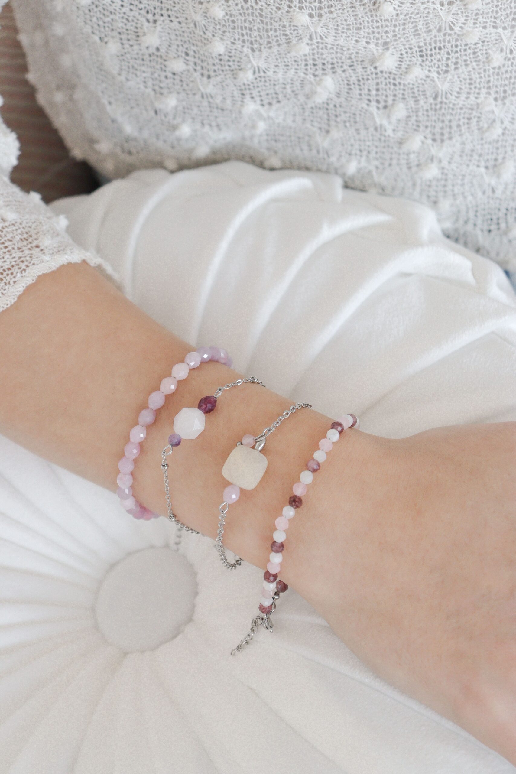 Jade & Kunziet Armband, gemaakt van stainless steel. De armband is ontworpen voor balans, rust en emotionele harmonie. De armband is afgewerkt met een facet geslepen vierkante jade steen als middelpunt, wat zorgt voor een luxe uitstraling en een prachtige lichtreflectie. Links van de Jade bevindt zich een zachte Kunziet kraal. Terwijl het subtiele hangertje is gemaakt van Lavendel Jade, samen een krachtige maar liefdevolle edelsteen combinatie.