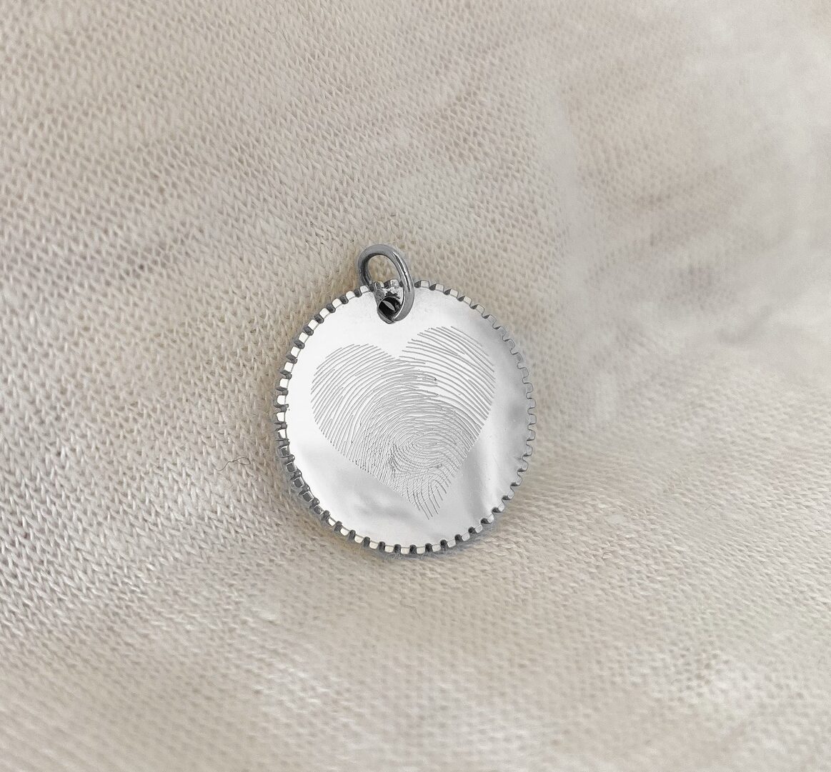 Vingerafdruk Hart Kartel Bedel, gemaakt van stainless steel. De ronde bedel heeft kleine karteltjes aan de zijkant. De afdruk wordt tot in klein detail in de bedel gegraveerd, hierdoor kun je de afdruk ook voelen. We kunnen van twee afdrukken een hartje maken, maar ook 1 afdruk dubbel gebruiken. Personaliseer de achterkant met een gravure en draag zo de bedel aan beide kanten. De Vingerafdruk Hart bedel is een dierbaar sieraad.