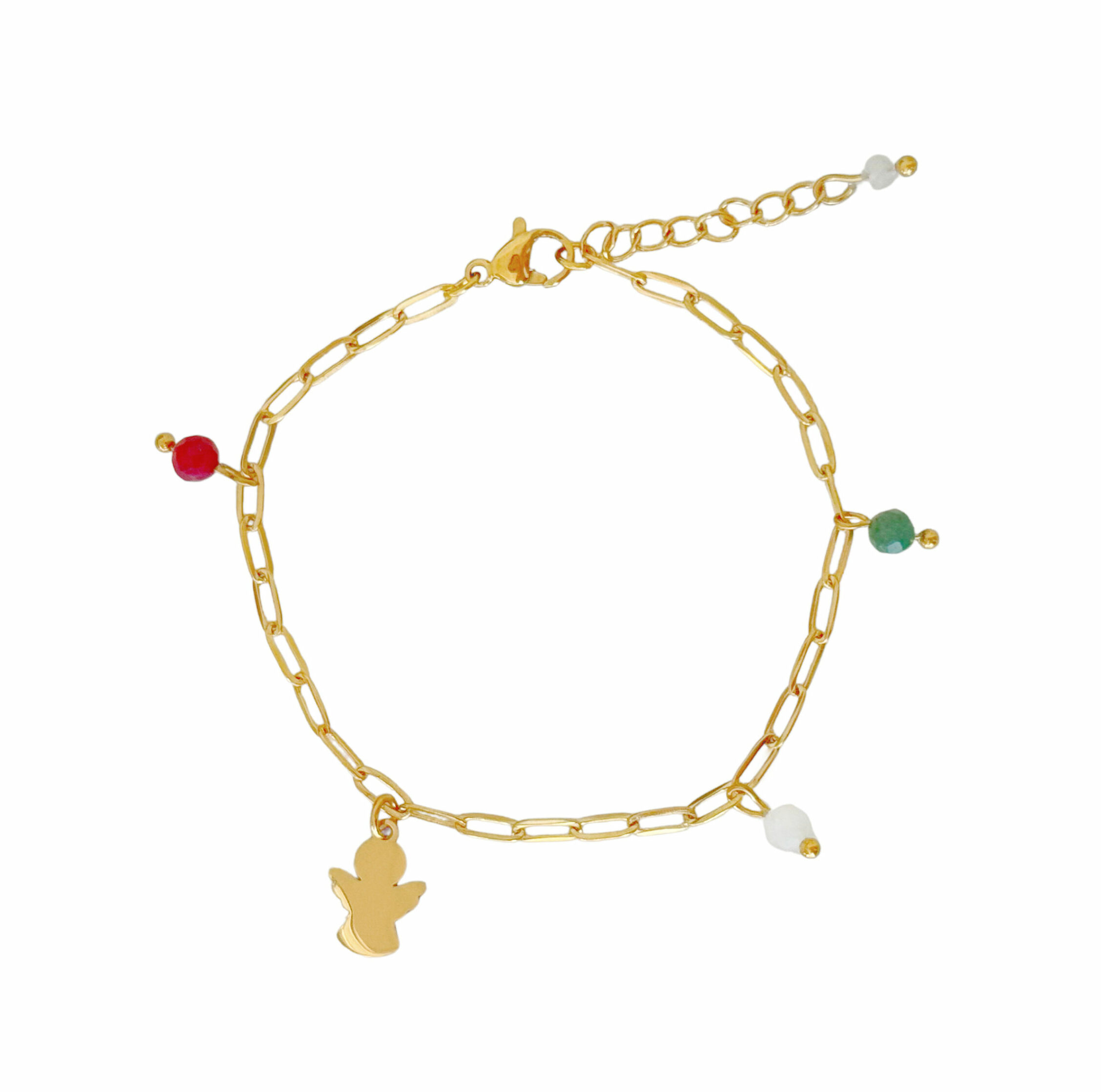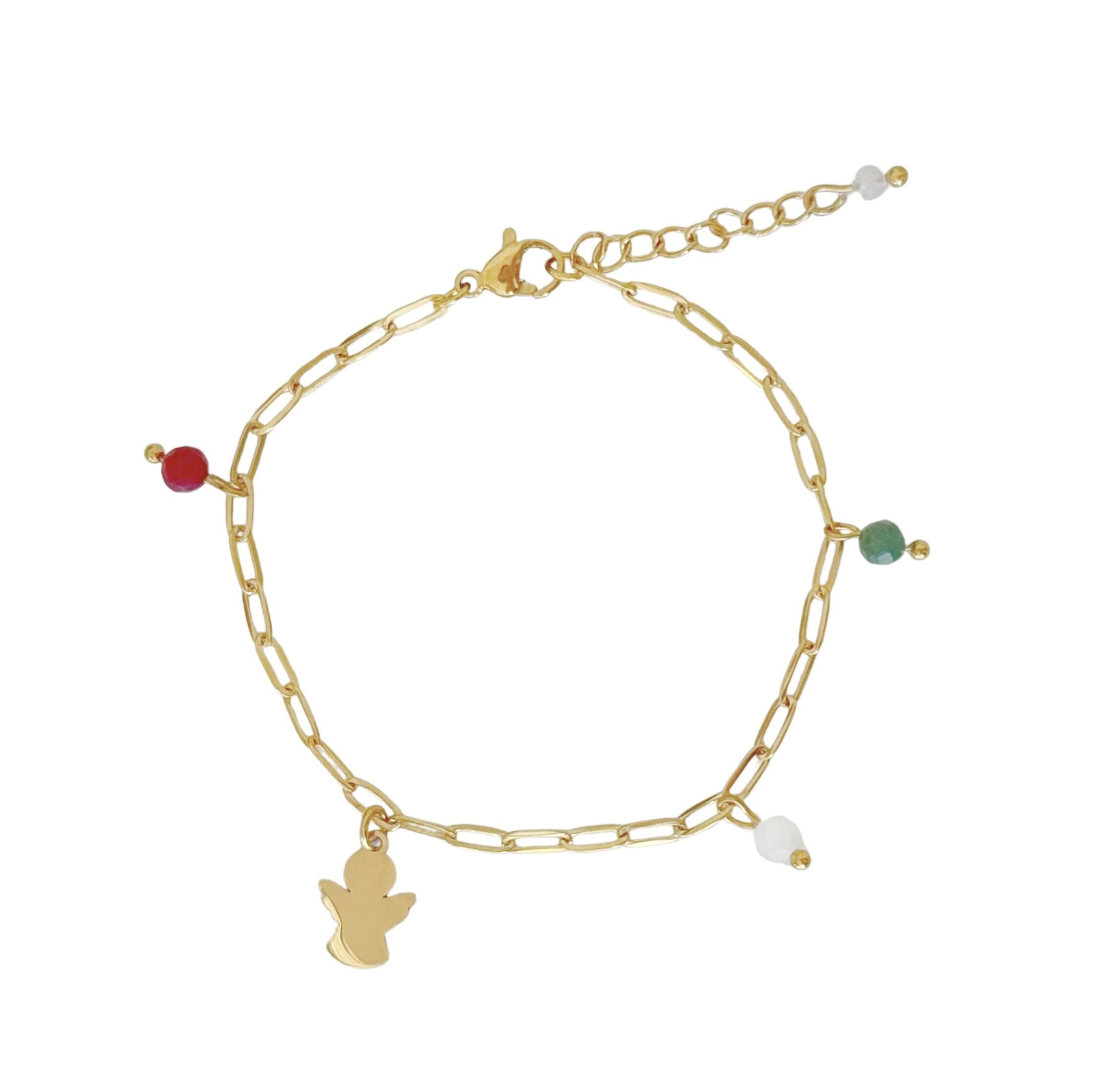 Te midden van deze stenen schittert een klein goudkleurig engeltje, een zacht symbool van bescherming en hoop. Een prachtig detail dat deze armband extra betekenisvol maakt.