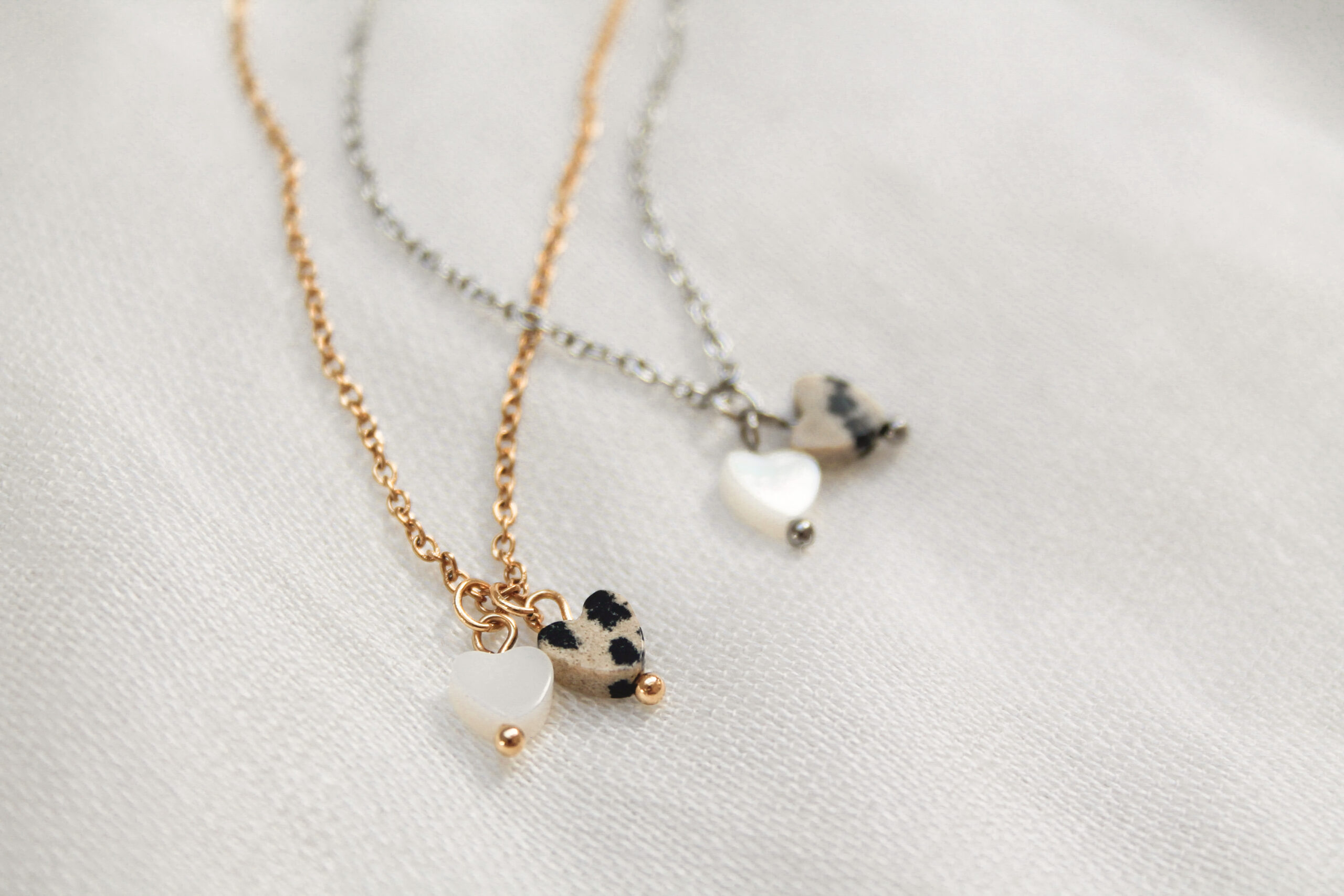 Ketting Dalmatiër Jaspis & Schelp Hartje. Stainless steel ketting met een Dalmatiër Jaspis hartje en een schelp hartje. Het schelp hartje heeft een prachtige parelmoer glans.
