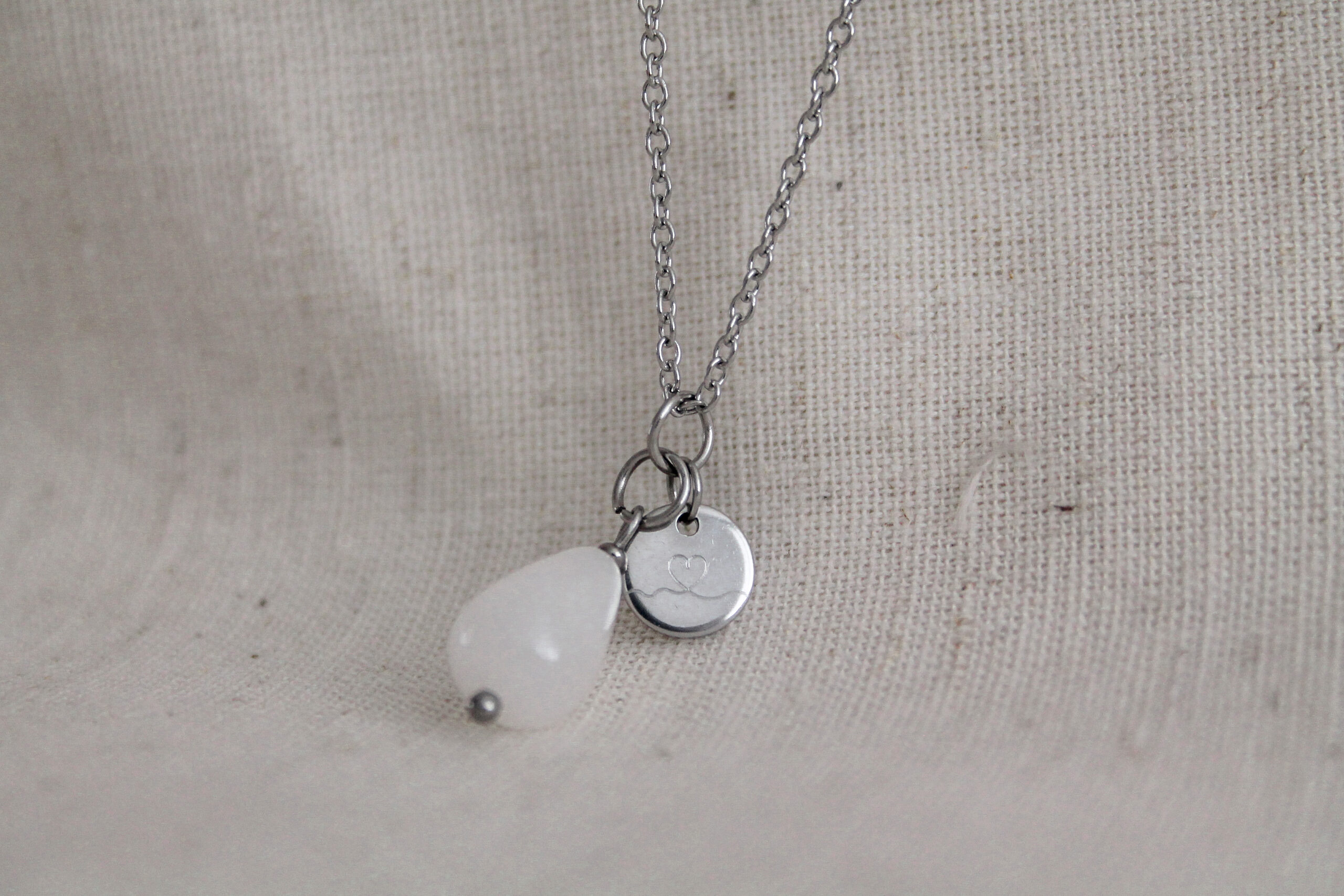 Stainless steel ketting met een druppelvormige Jade hanger en daarnaast een stainless steel bedeltje met een hartje er op gegraveerd. Het bedeltje is uniek en gegraveerd in ons atelier.