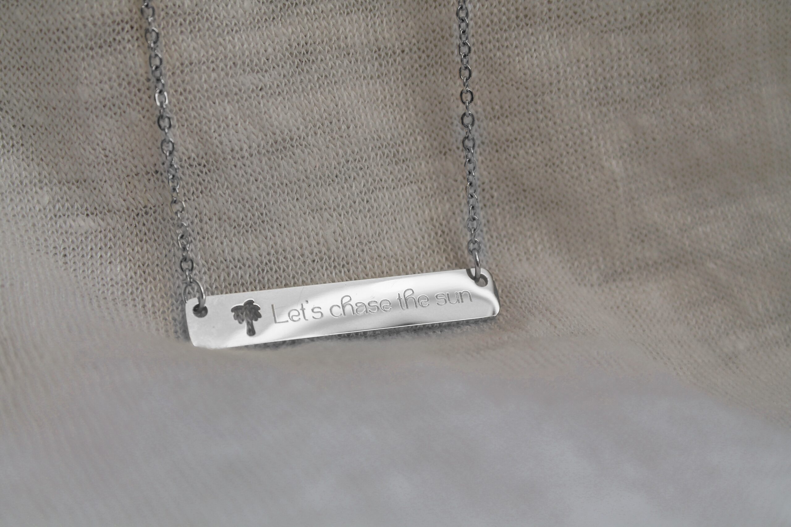 Stainless steel ketting met een stainless steel plaatje. Op het plaatje staat de tekst "Let's chase the sun" en naast deze tekst is een kleine uitsnede van een palmboom. Een leuk cadeau voor jezelf, maar ook voor iemand die bijvoorbeeld gaat reizen.