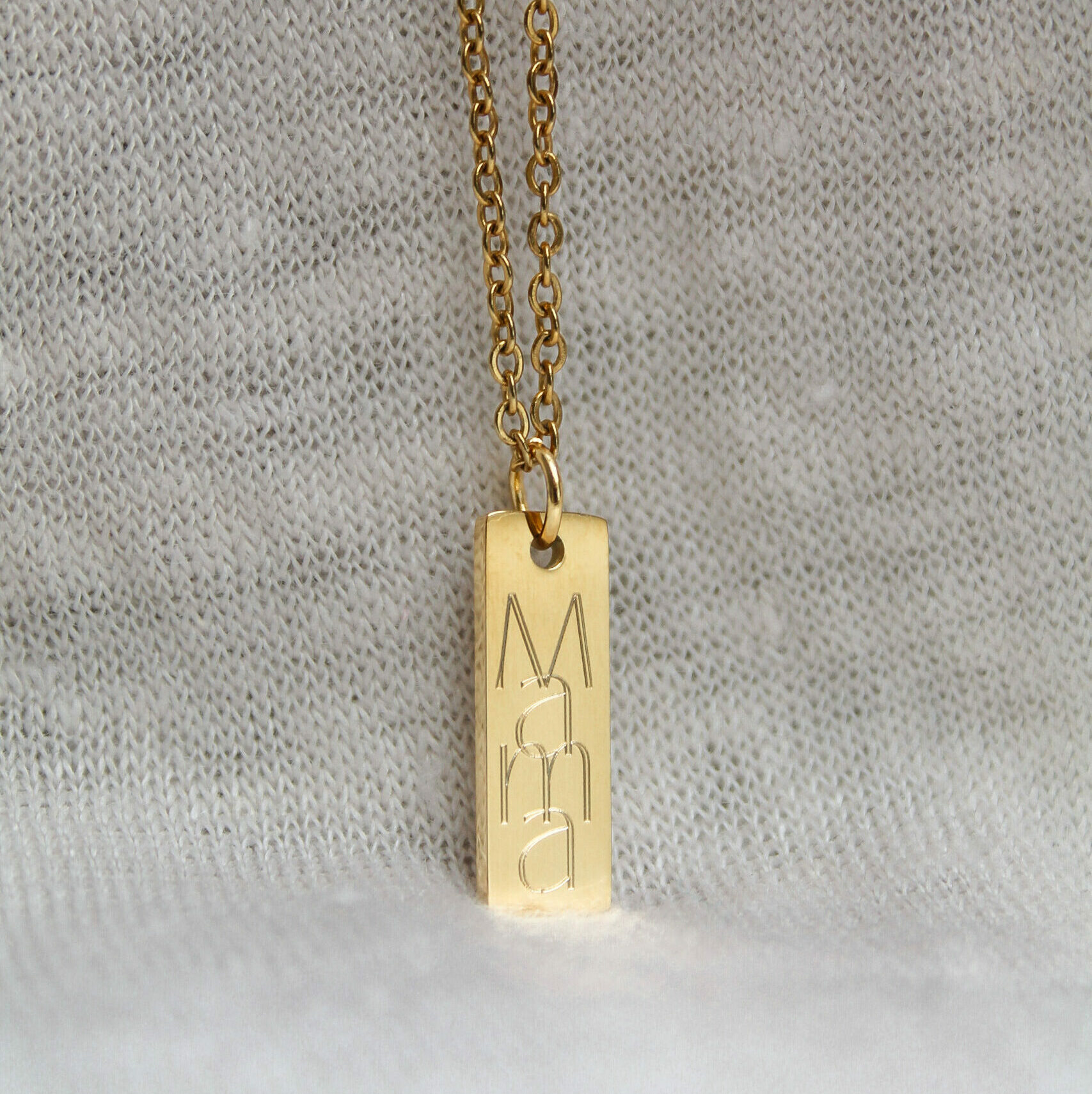 De rechthoekige bedel straalt eenvoud en kracht uit. Met zijn strakke lijnen en tijdloze vorm is hij perfect om een naam te dragen die zoveel betekent. Mama, gegraveerd in elegant en fijn detail, staat centraal op deze minimalistische hanger, zodat de boodschap helder en puur blijft.