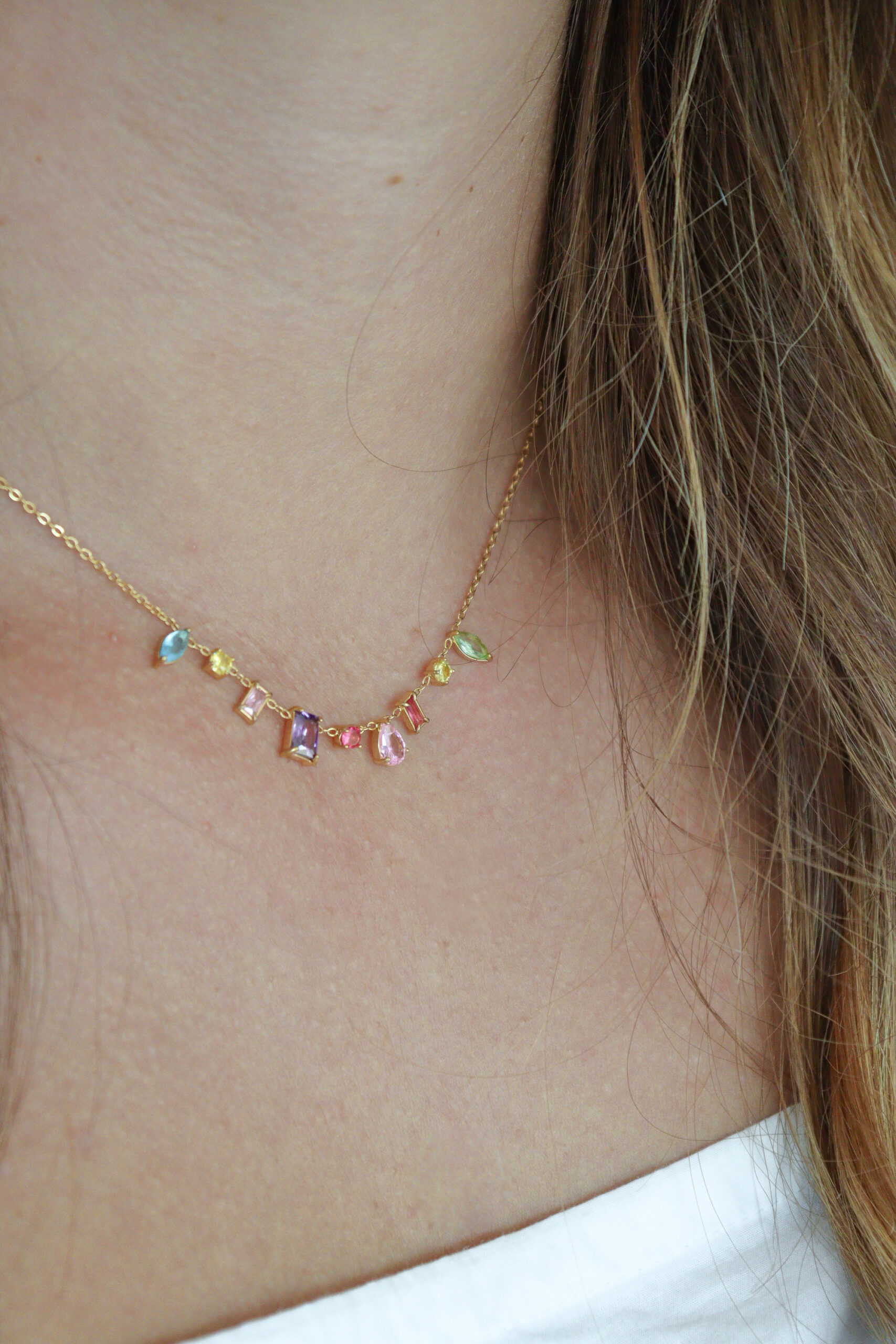 Wat de Meliora ketting zo bijzonder maakt, is de speelse mix van vormen en tinten. Van zachte roze en paarse accenten tot fris blauw en sprankelend groen.Elk steentje is zorgvuldig geplaatst om een harmonieuze, maar levendige uitstraling te creëren. De ketting vangt het licht prachtig en geeft je look direct een elegante en vrolijke touch.