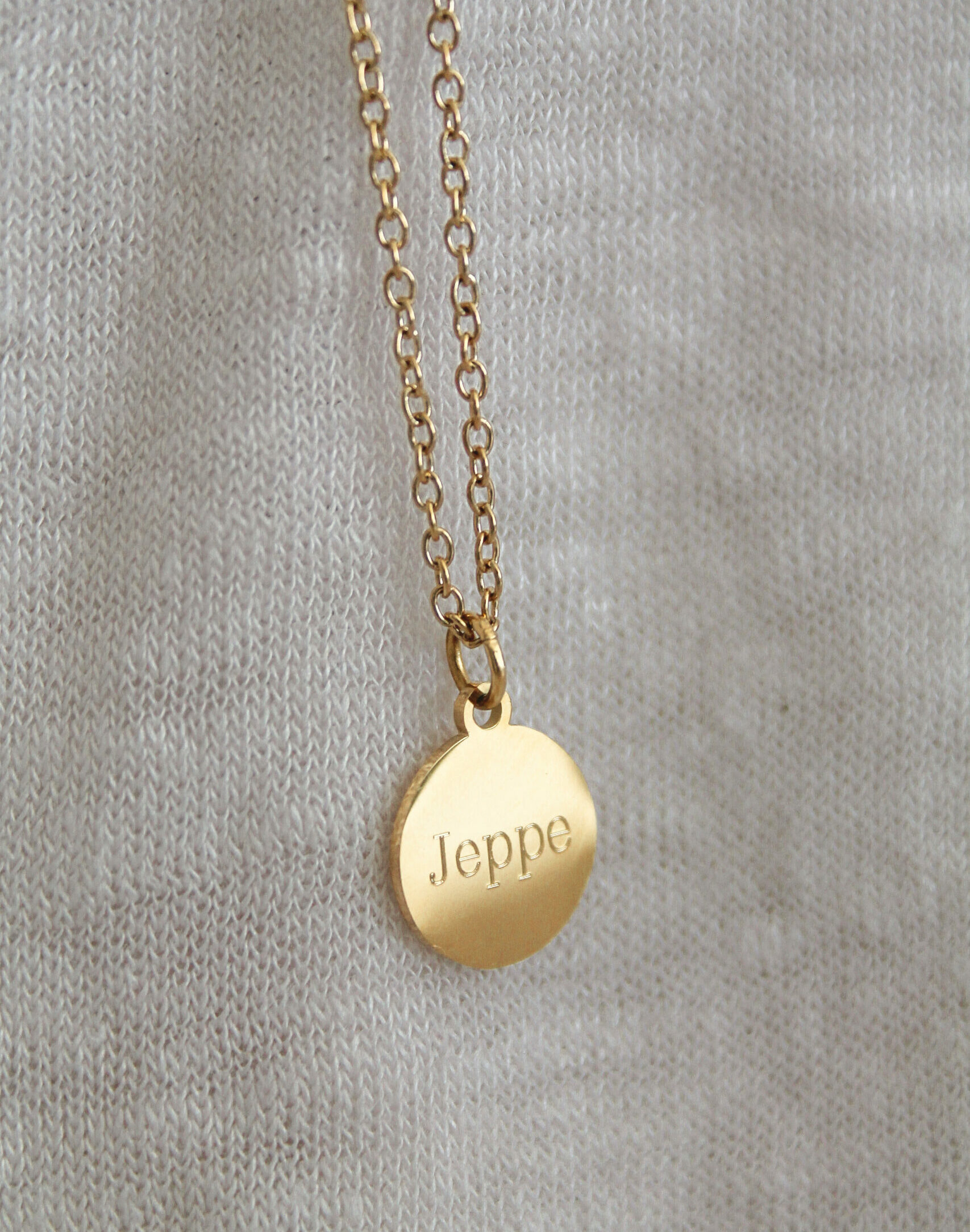 Stainless steel ketting met een stainless steel rond bedeltje. Op het bedeltje kan een naam met maximaal 5 letters gegraveerd worden. Het bedeltje is hoog gepolijst en glanst daardoor als een spiegeltje.