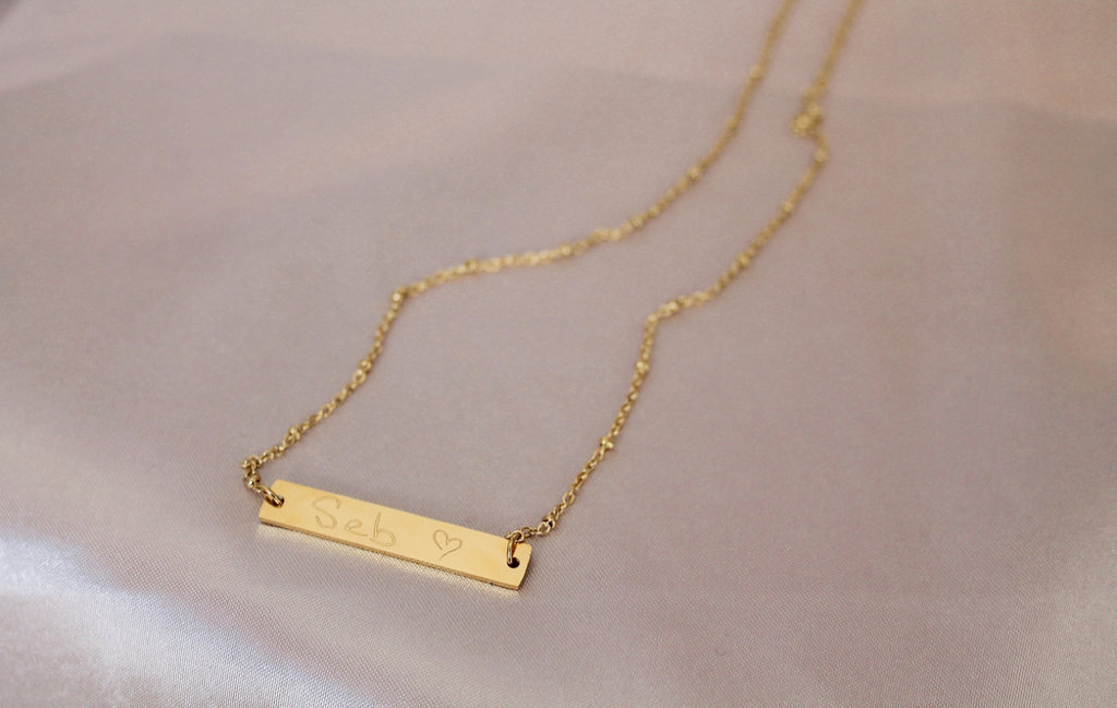 De ketting en het plaatje zijn gemaakt van Stainless steel. Laat een door jou of door iemand anders handgeschreven naam graveren. We hebben zelf een hartje gemaakt, die kun je achter de naam laten graveren.