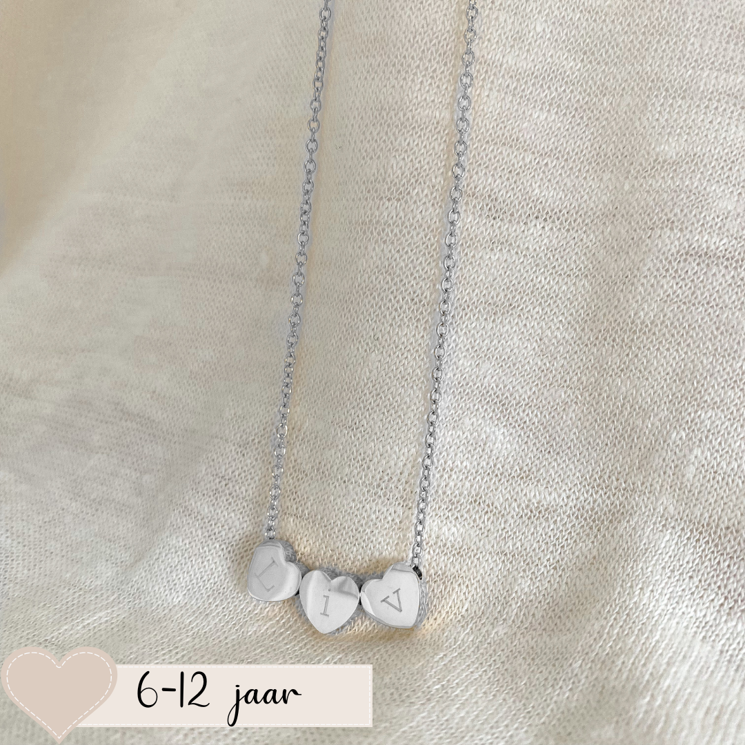 Kinderketting hartjes initialen, gemaakt van stainless steel. Kies 1 tot 6 hartjes en laat ons weten welke initialen er op gegraveerd mogen worden. Wil je graag ook een gravure op de achterkant? Vink dit dan aan.