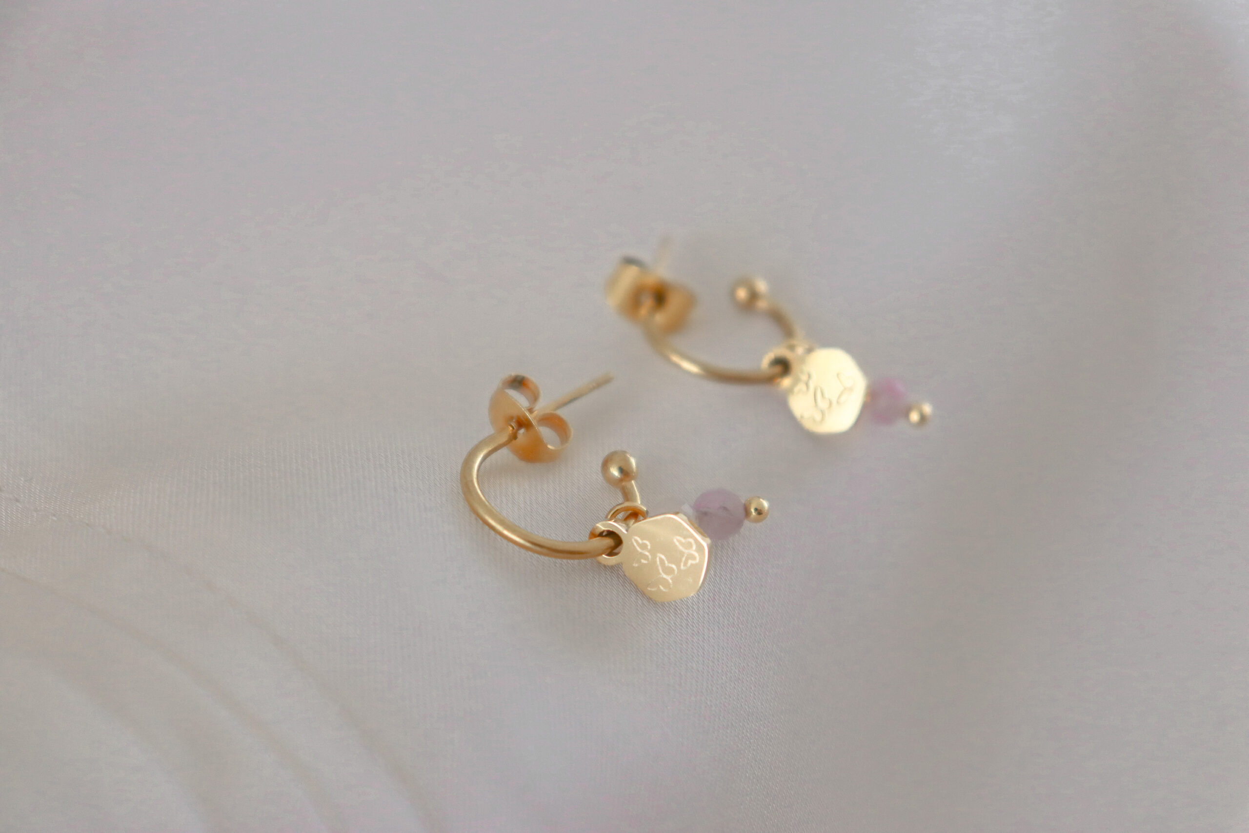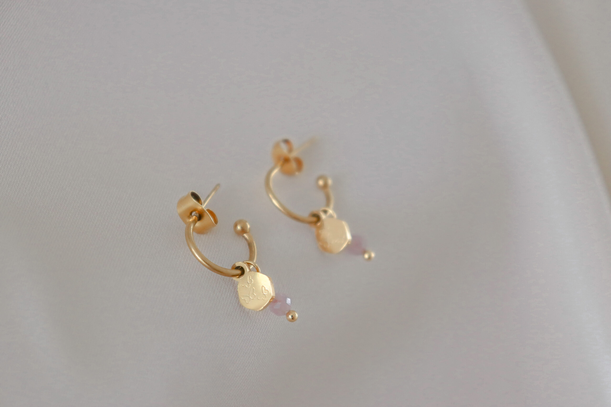 De Kunziet, Maansteen & Vlindertjes Oorringen zijn elegante, handgemaakte oorbellen die stijl en betekenis combineren. Het kleine zeshoekige bedeltje is in onze studio gegraveerd met drie vlindertjes – een symbool voor groei, transformatie en vrijheid. De facetgeslepen Kunziet- en Maansteentjes glinsteren prachtig en maken elk paar oorringen uniek.