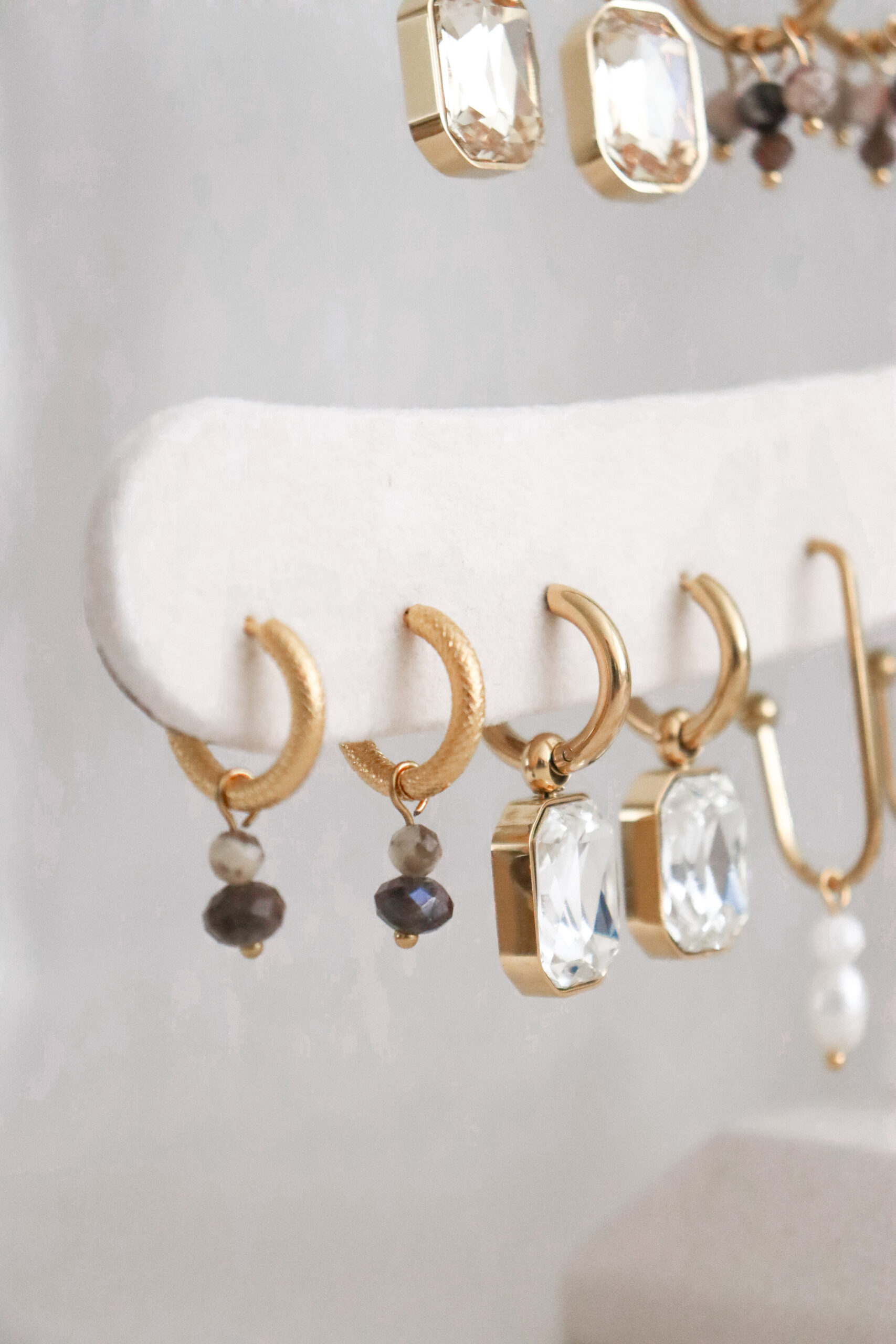 Labradoriet & Zebra Veldspaat Oorringen – Goud, gemaakt van stainless steel. De oorringen zijn hypoallergeen, sterk, duurzaam en verkleuren niet. Het bruine Labradoriet steentje heeft een mooie blauwe “flash” vanaf bepaalde hoeken. Beide steentjes zijn facet geslepen en schitteren mooi. Je vindt beide steentjes in meerdere nieuwe sieraden in de collectie, zo kun je een mooie set maken.