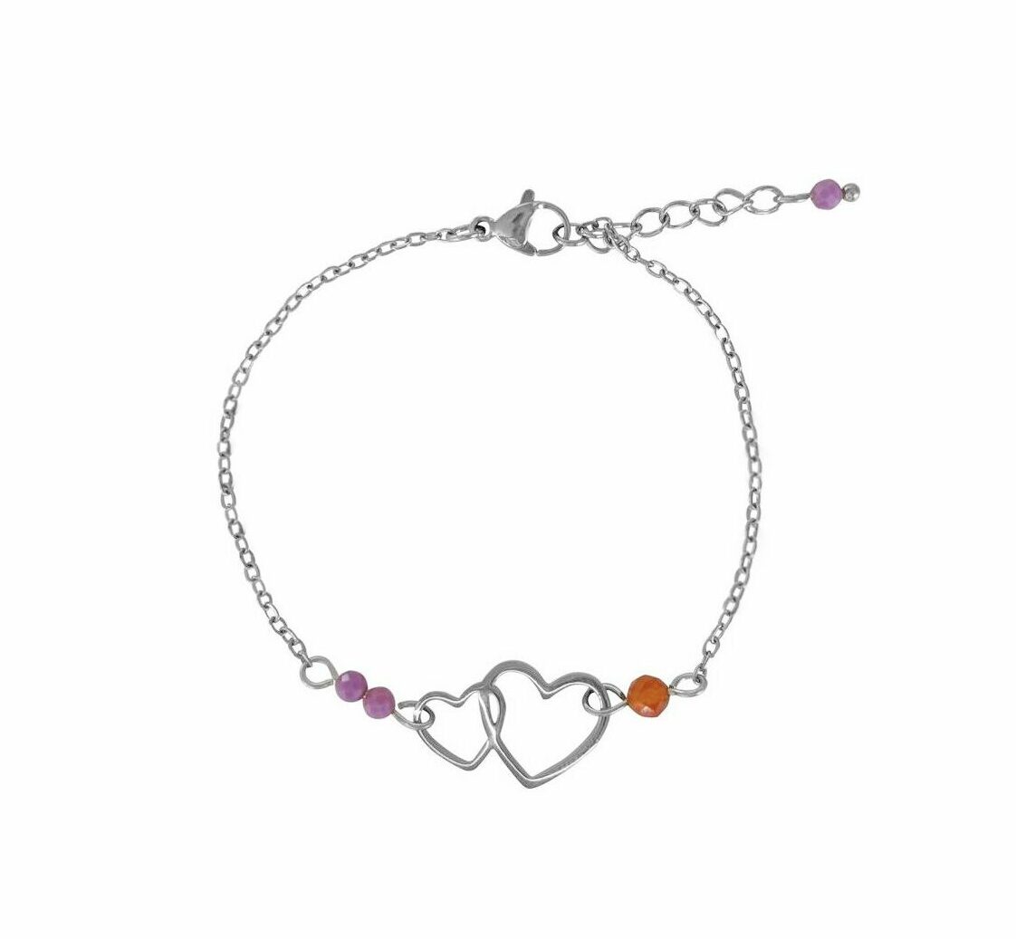 Liefdevol & Moedig Armbandje, gemaakt van stainless steel. Aan het armbandje vind je twee Lepidoliet steentjes en een Carneool steentje. Ook vind je aan het verlengkettinkje een Lepidoliet steentje. Alle steentjes zijn facet geslepen en schitteren mooi. De hartjes zijn hoog gepolijst en hebben een mooie glans, hierdoor hebben ze een luxe uitstraling. Het handgemaakte armbandje is hypoallergeen, sterk, duurzaam en kleurvast. Wij maken alle sieraden in ons eigen atelier.