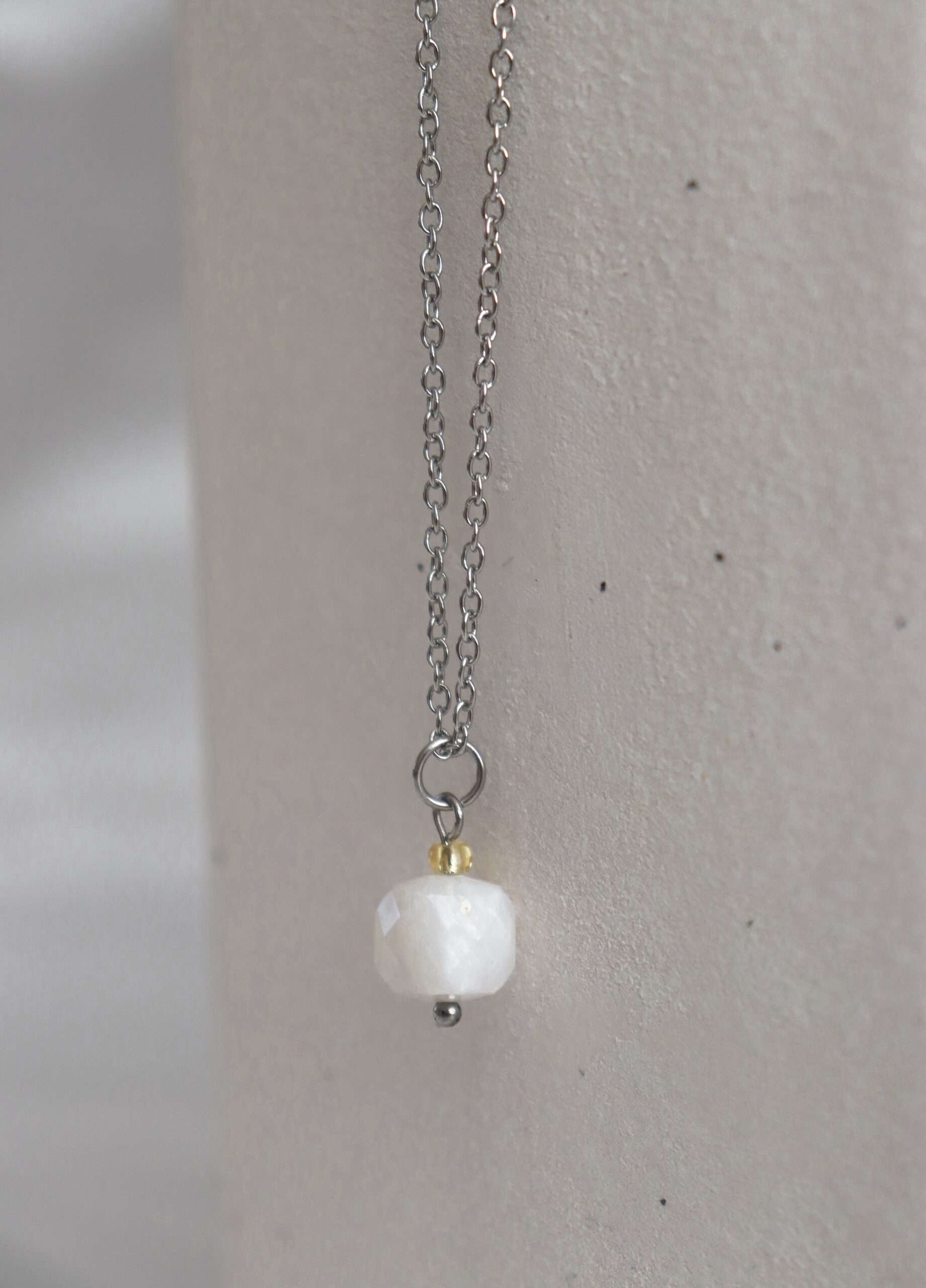 Maansteen facet ketting, gemaakt van stainless steel. De Maansteen is werkelijk prachtig! De kubus is facet geslepen en glinstert vanuit elke hoek. Boven de kubus zit een klein gouden kraaltje. Elke steen is uniek dus elke Maansteen facet ketting is uniek!