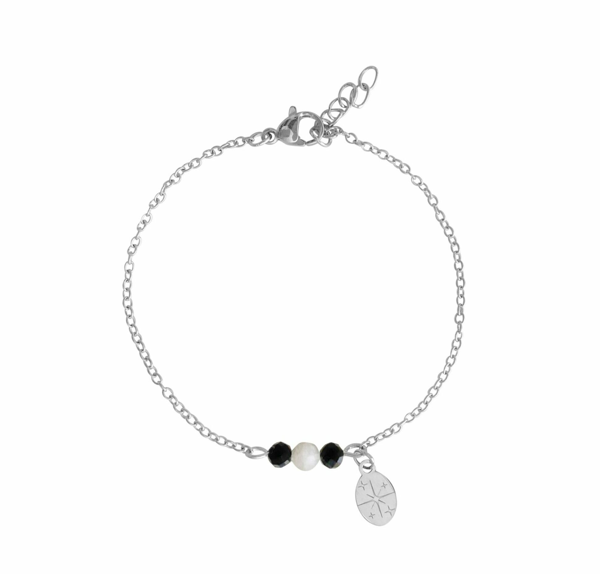 Maansteen & Toermalijn sparkle armband, gemaakt van stainless steel. De edelsteentjes zijn facet geslepen en hebben een mooie schittering. Op het bedeltje zijn sterretjes gegraveerd. Het bedeltje is uniek en door ons ontworpen en gegraveerd in eigen atelier.