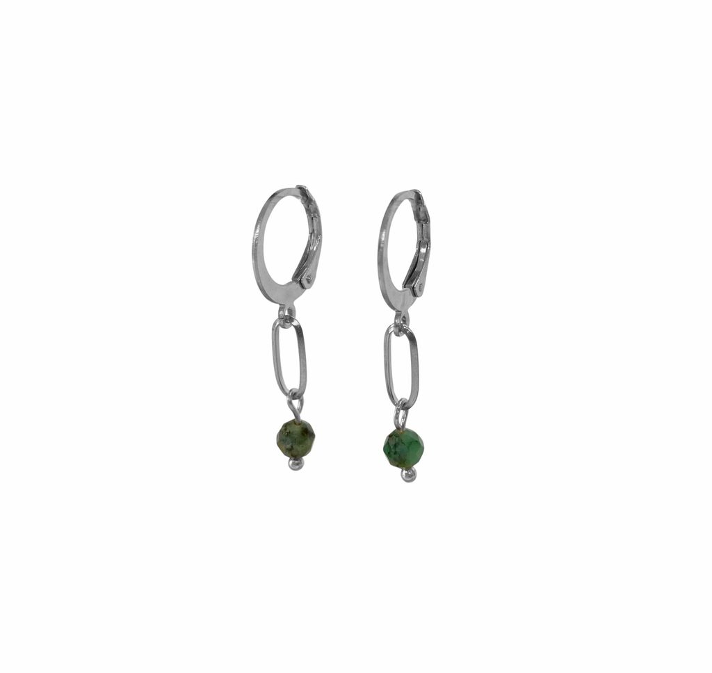 Oorbellen Smaragd. De oorbellen zijn gemaakt van stainless steel met een Smaragd steentje. Het opvallendste detail is de hanger: een kleine, ovale schakel waaraan een klein, rond smaragd steentje hangt. Het Smaragd steentje is facet geslepen en schittert mooi. Smaragd staat symbool voor groei, balans en elegantie, en de diepe groene kleur geeft deze oorbellen een chique en tijdloze look