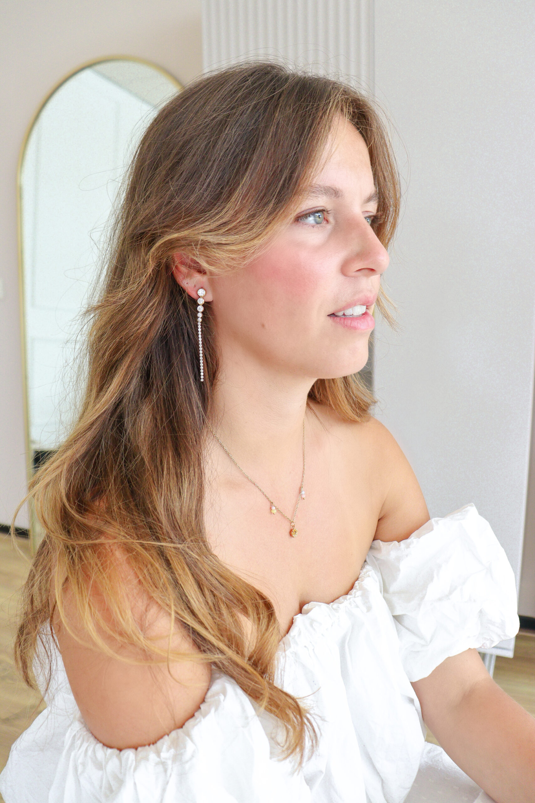 De Stellara oorhangers zijn een verfijnde ode aan elegantie en sprankeling. De oorbellen bestaan uit meerdere zirkonia steentjes die sierlijk onder elkaar hangen, waardoor ze bij iedere beweging subtiel het licht vangen. Alsof kleine sterren langs je gezicht dansen.