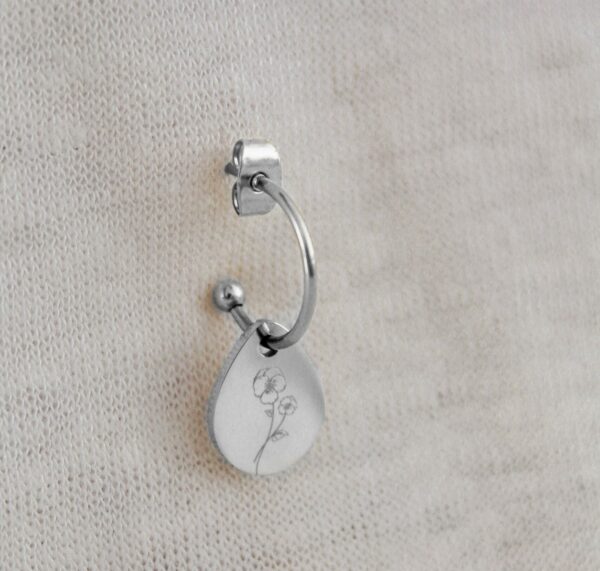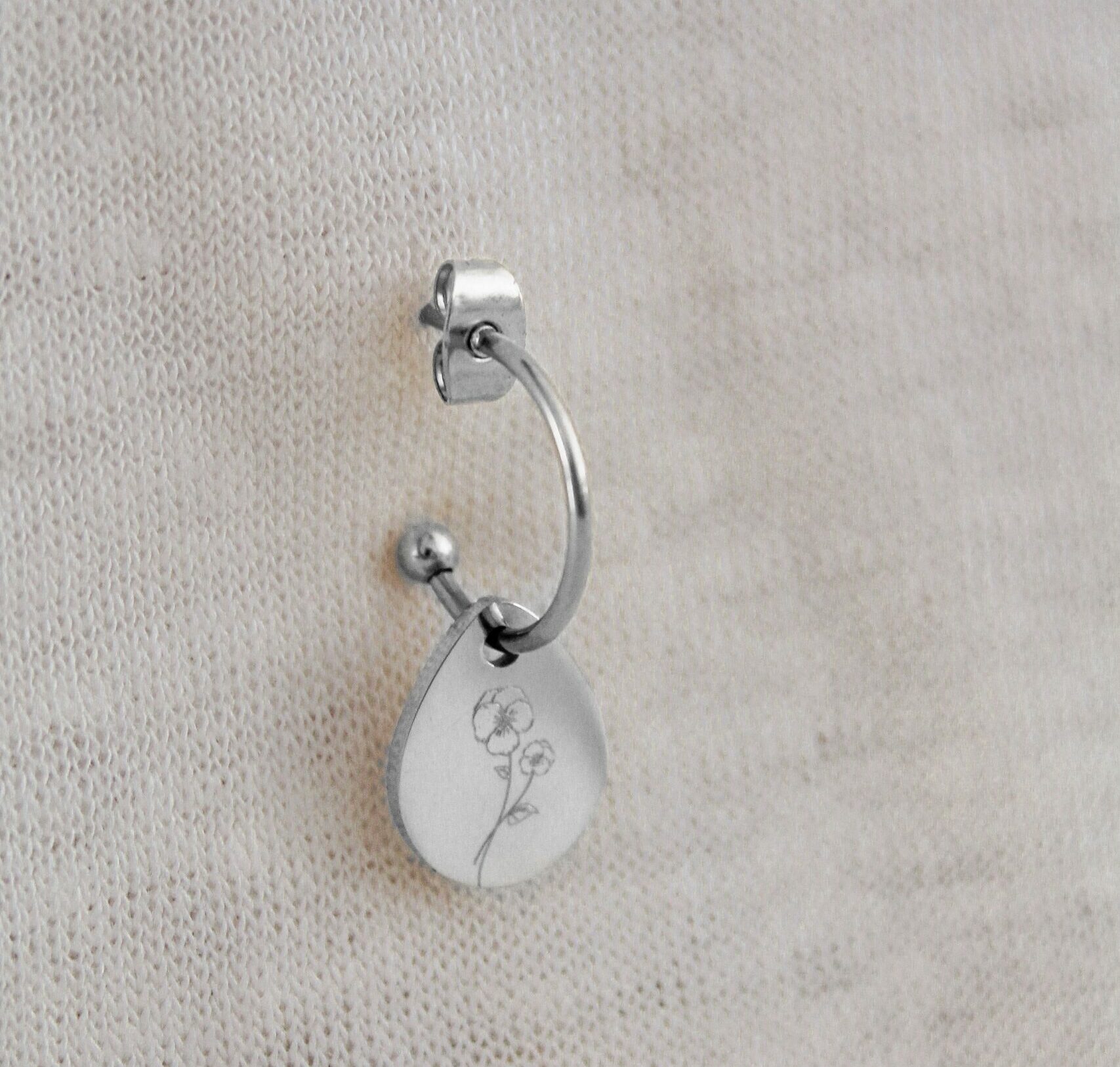 Stainless steel oorring met een stainless steel druppel bedel. Draag de geboortebloem van je kindje, je geliefde of een dierbaar persoon altijd bij je.