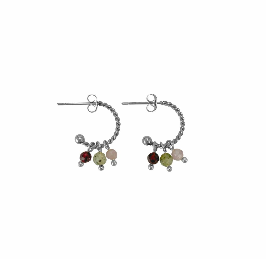 Oorringen Granaat, Prehniet & Kunziet. De oorringen zijn gemaakt van stainless steel met de drie prachtige hangertjes van stenen Granaat, Prehniet en Kunziet. Ze vormen samen ook een hele mooie kleurencombi. Het half open ontwerp zorgt voor gemakkelijk dragen en comfort, terwijl de gedraaide structuur de oorringen een dynamisch en opvallend detail geeft. De kleine hangertjes van Granaat, Prehniet en Kunziet bewegen speels mee, waardoor het sieraad altijd in het oog springt.